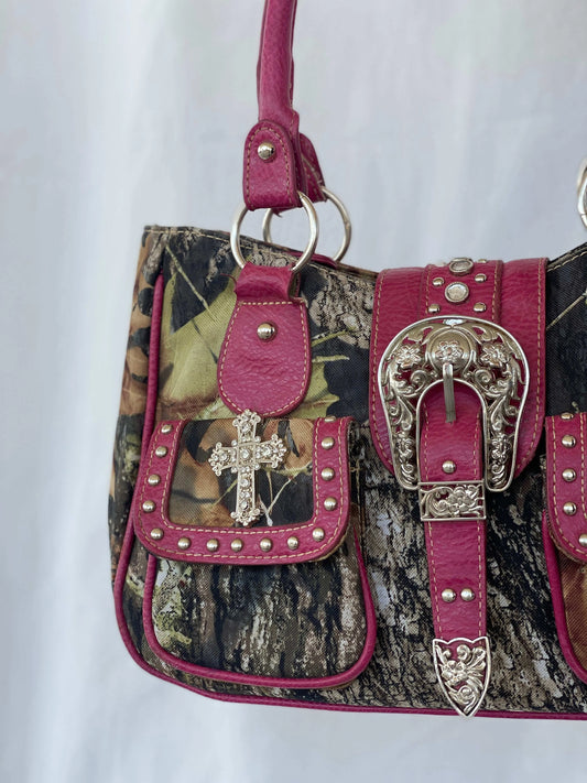 حقيبة كتف وردية تمويه غربية Y2K مزينة بأحجار الراين ومزودة بإبزيم
