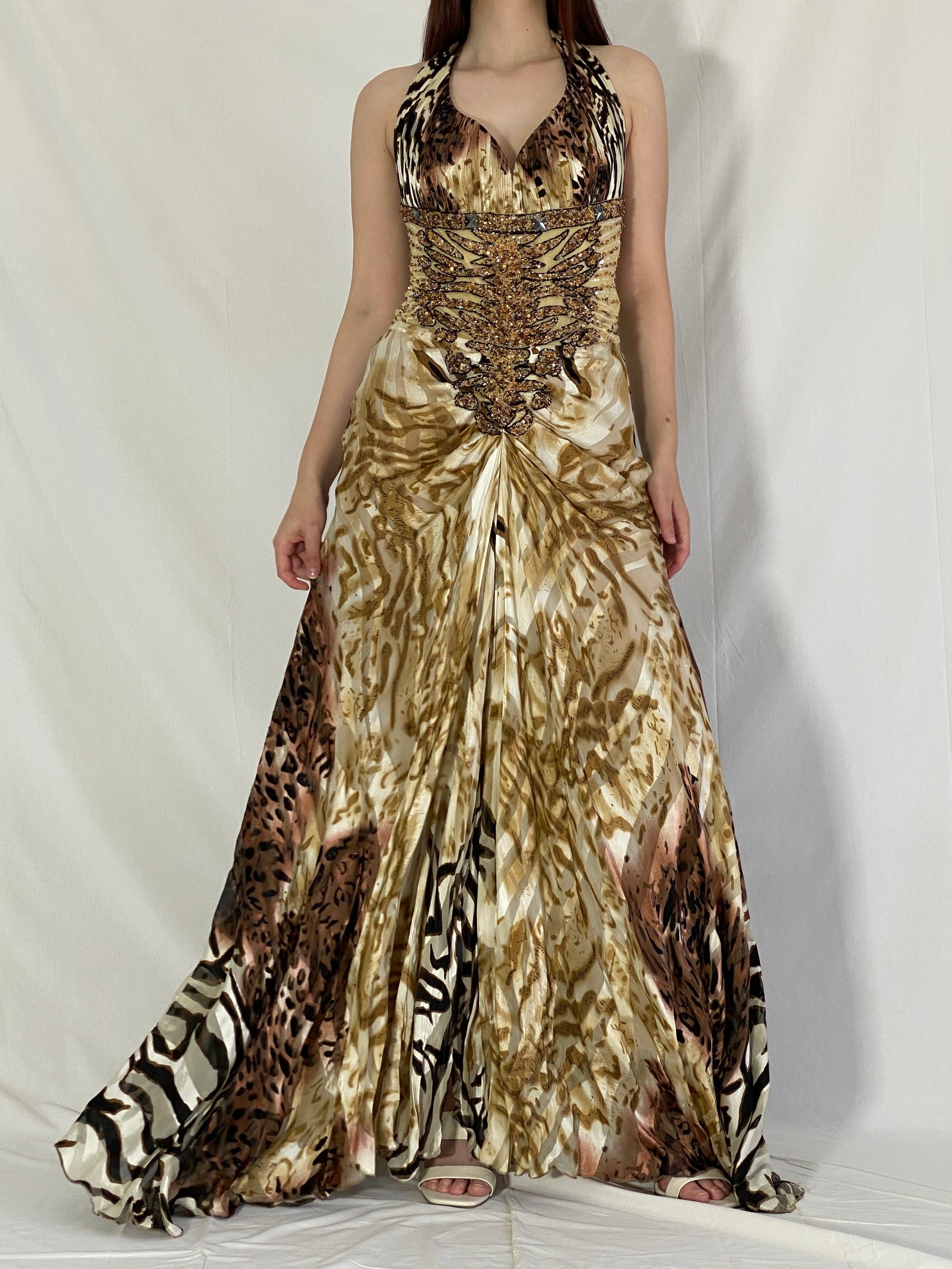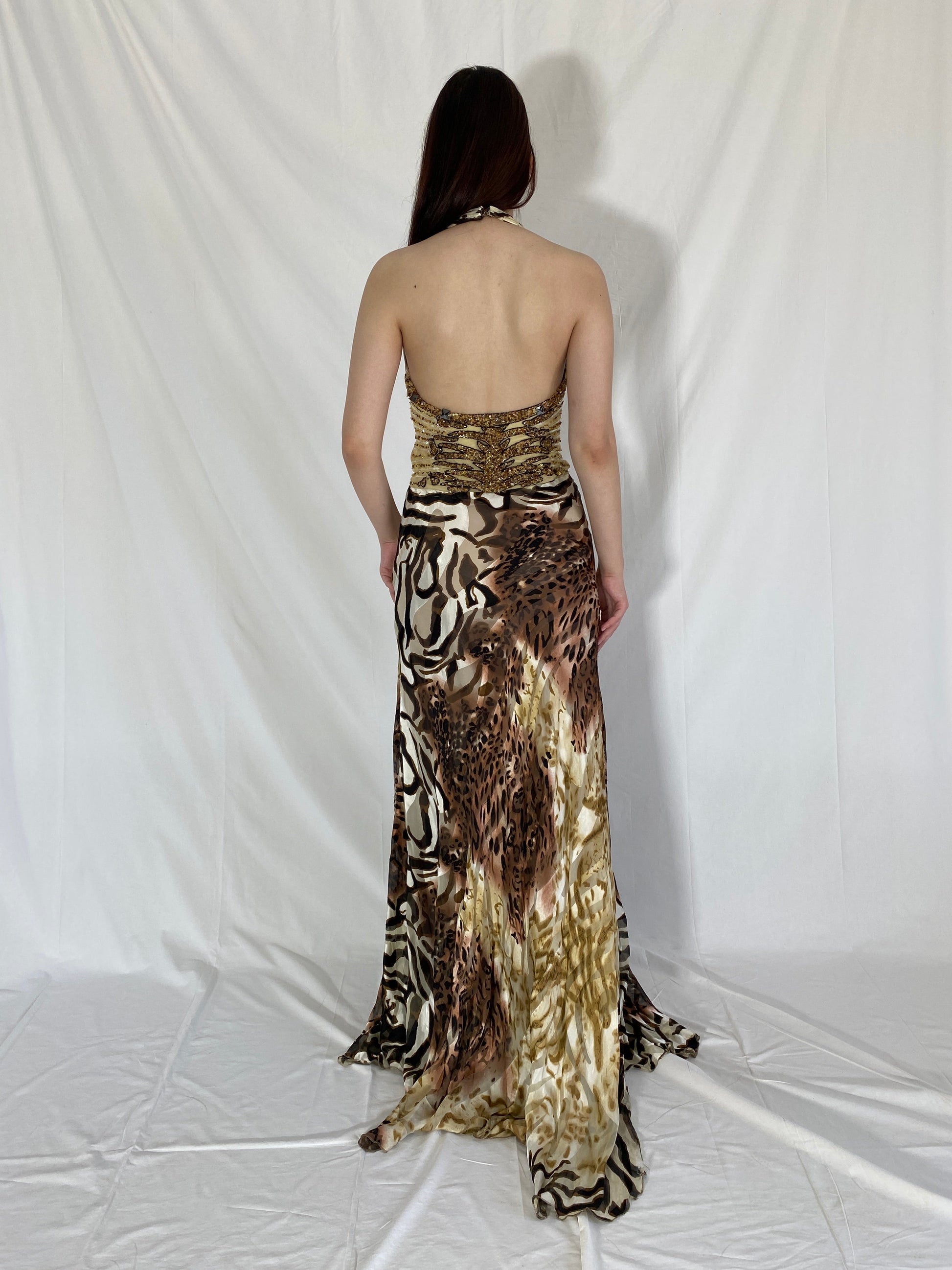 فستان سهرة بحمالة عنق مطرز بنقشة حيوانات من ستايل روبرتو كافالي - مقاس S من ستايتمنت Y2K الرجاء كوتور