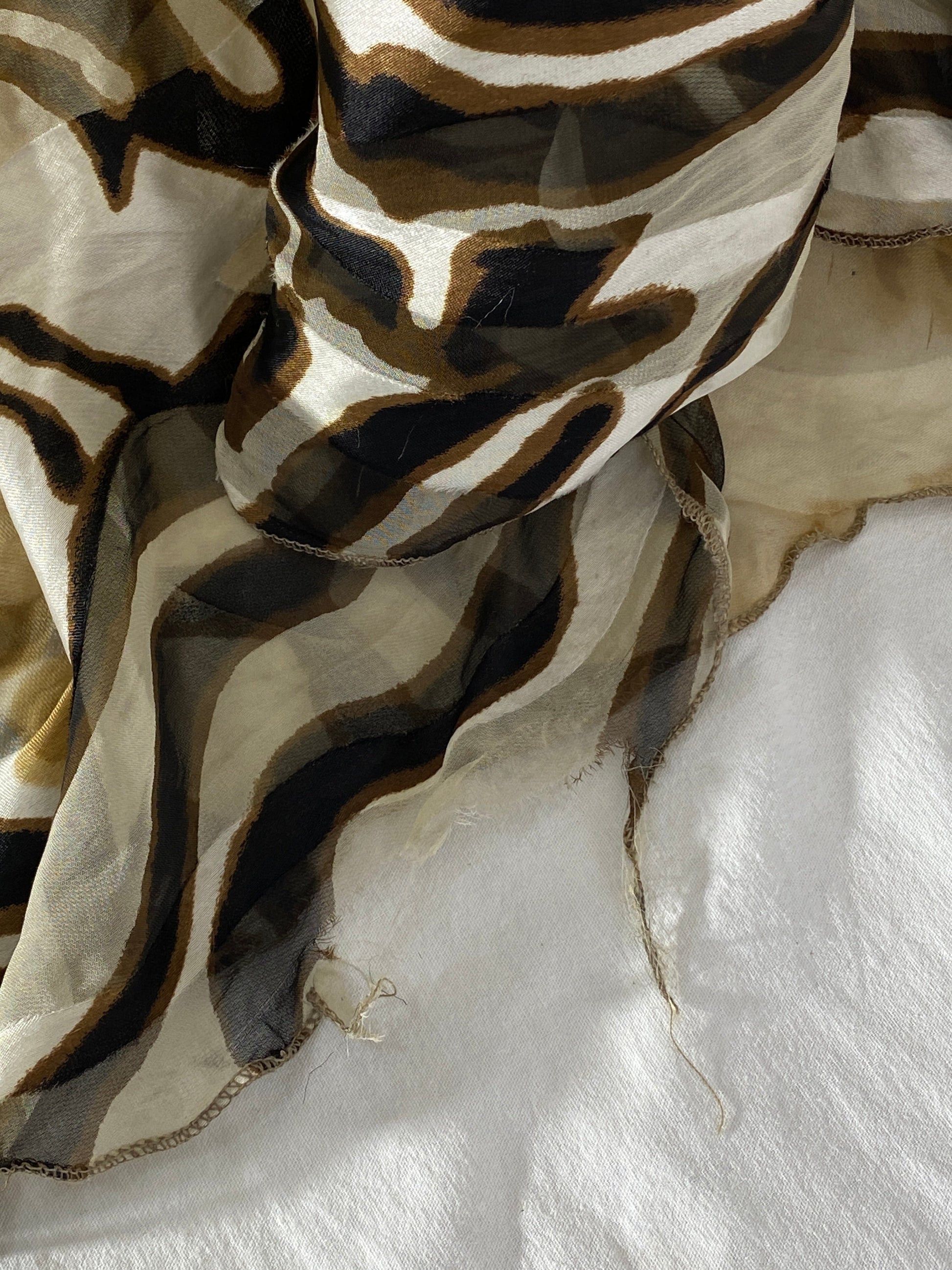 انغمس في بريق Y2K الخالص مع هذا الفستان Alrajaa المستوحى من Roberto Cavalli، المصنوع في سوريا في أواخر التسعينيات/أوائل الألفينات. قطعة بيان حقيقية، هذا الفستان الماكسي بطبقة هالتر مغطى بساتان فاخر بطبعة حيوانات مزيجة بين الفهد والحمار الوحشي، يشع أناقة غريبة.