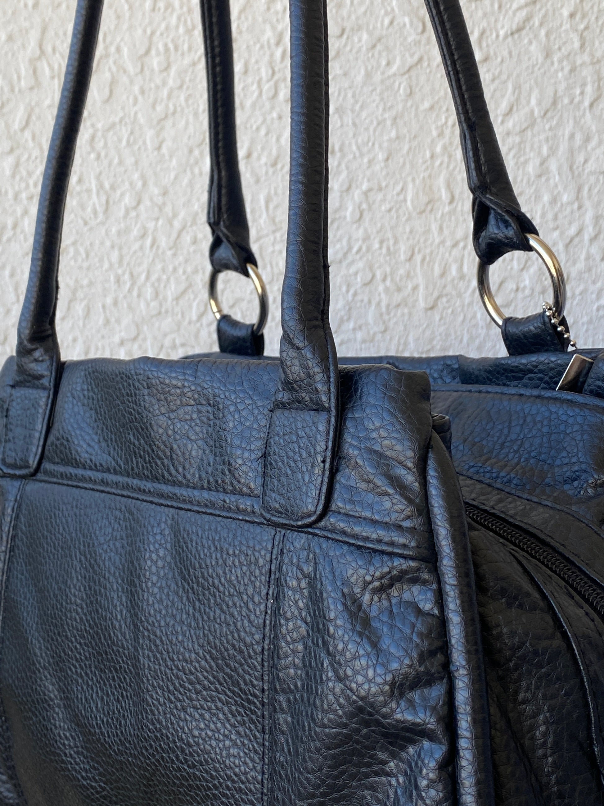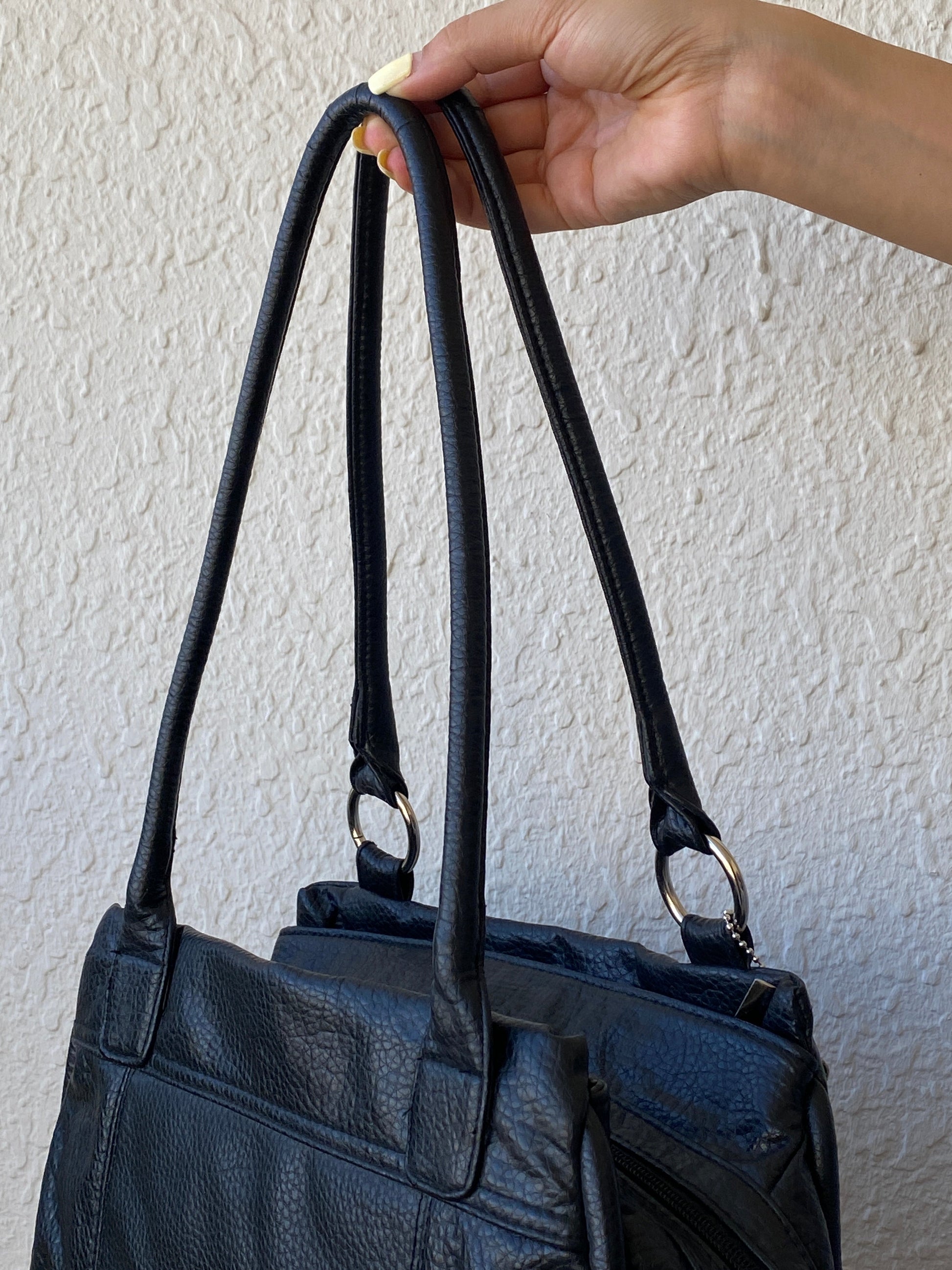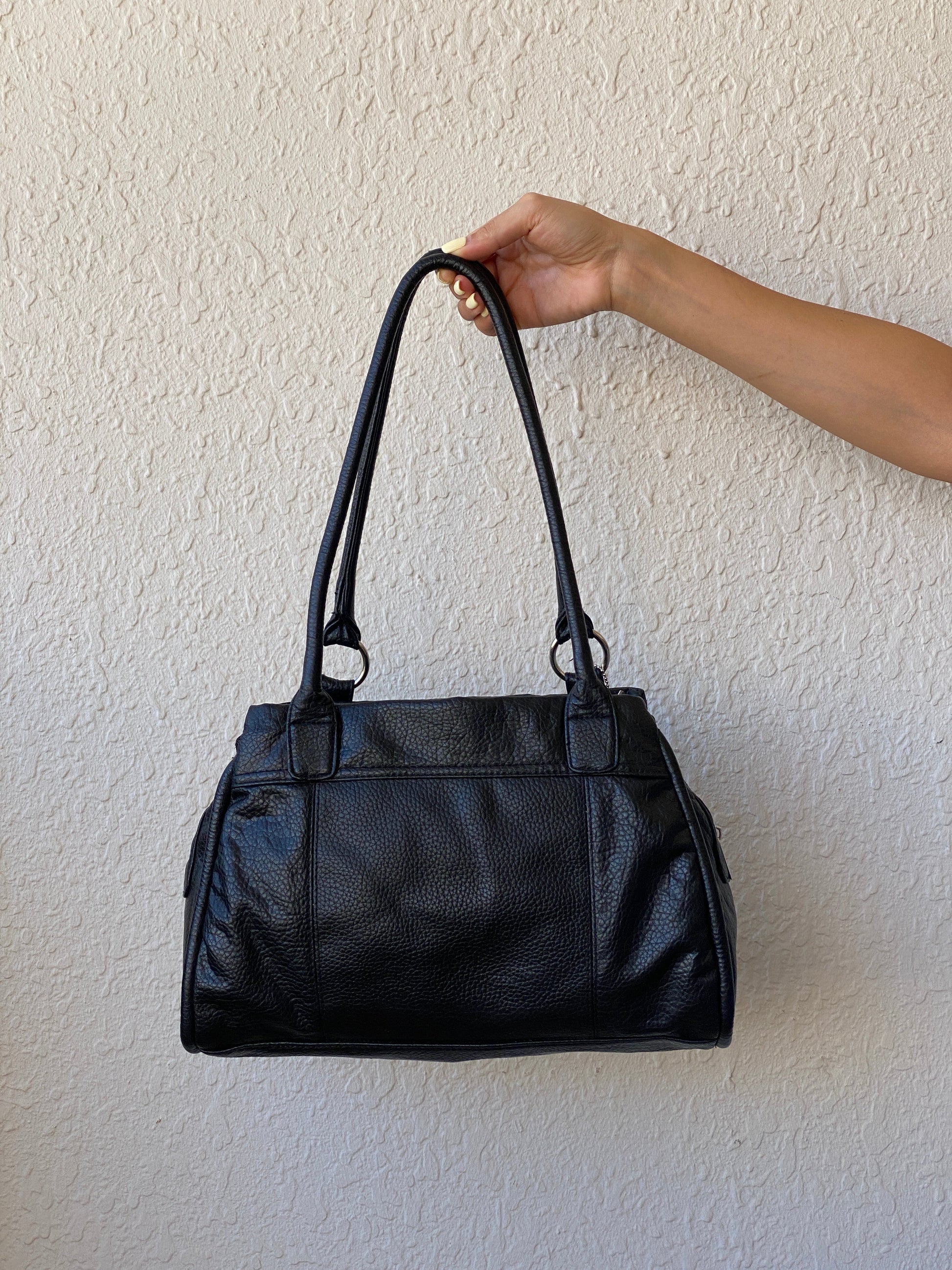 حقيبة كتف من الجلد الطبيعي الأسود – حقيبة يومية واسعة مع عدة جيوب