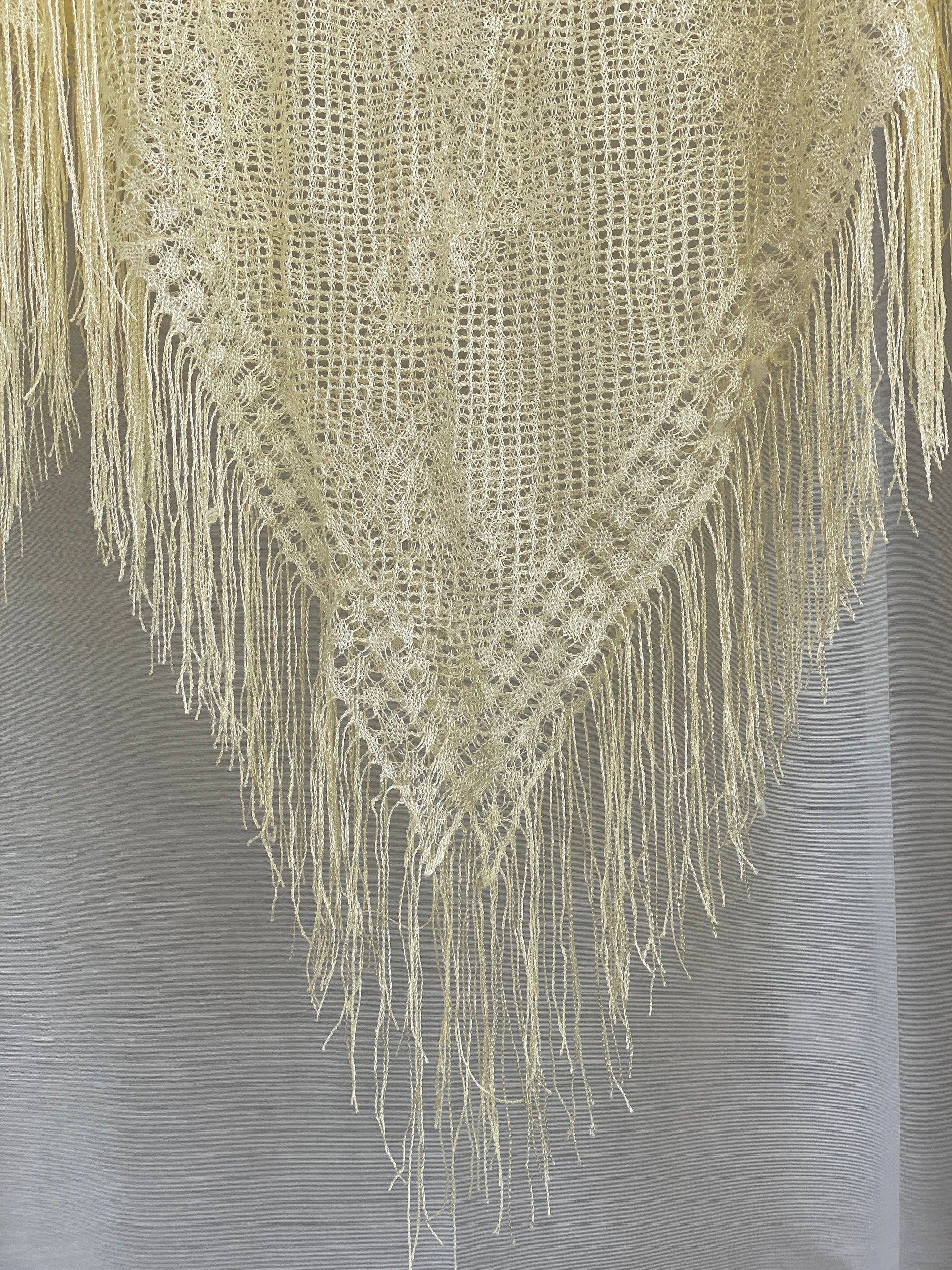 - التصميم: كروشيه مفتوح بنقوش زهرية، شكل مثلث، حافة طويلة من الشراريب