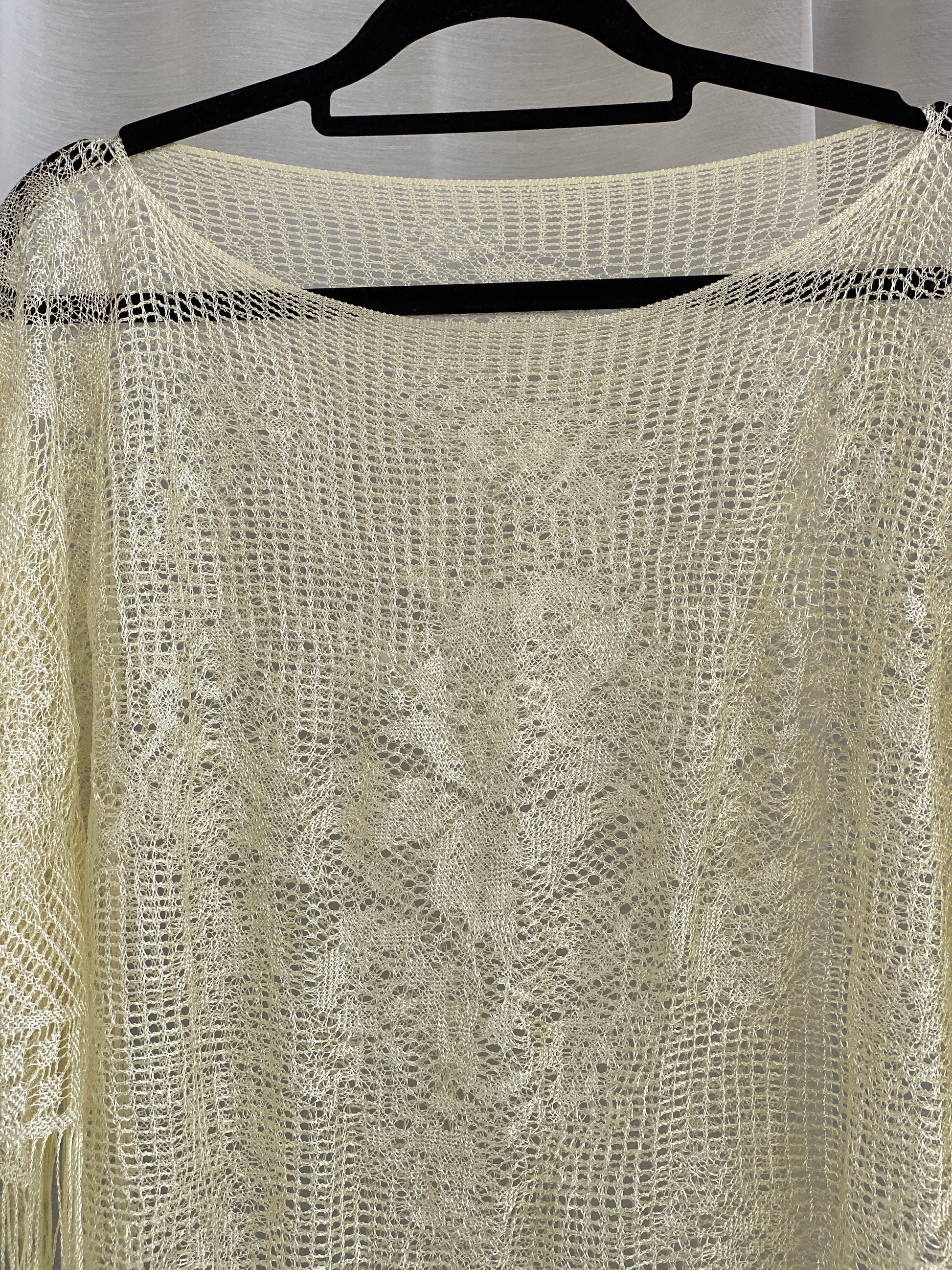 شال كروشيه كريمي بحواف متدلية – شال بونشو بوهو مفتوح الحياكة