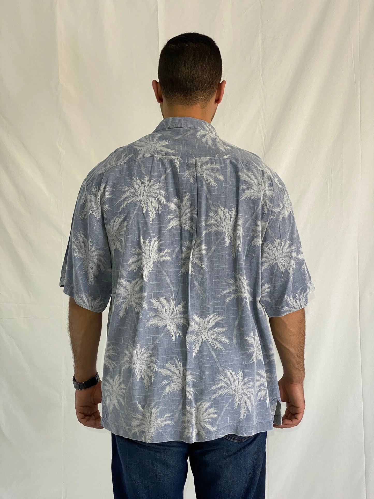 قميص بطبعة شجرة نخيل من جافايكا جاكس 100% حرير أزرق استوائي للمنتجع - XL