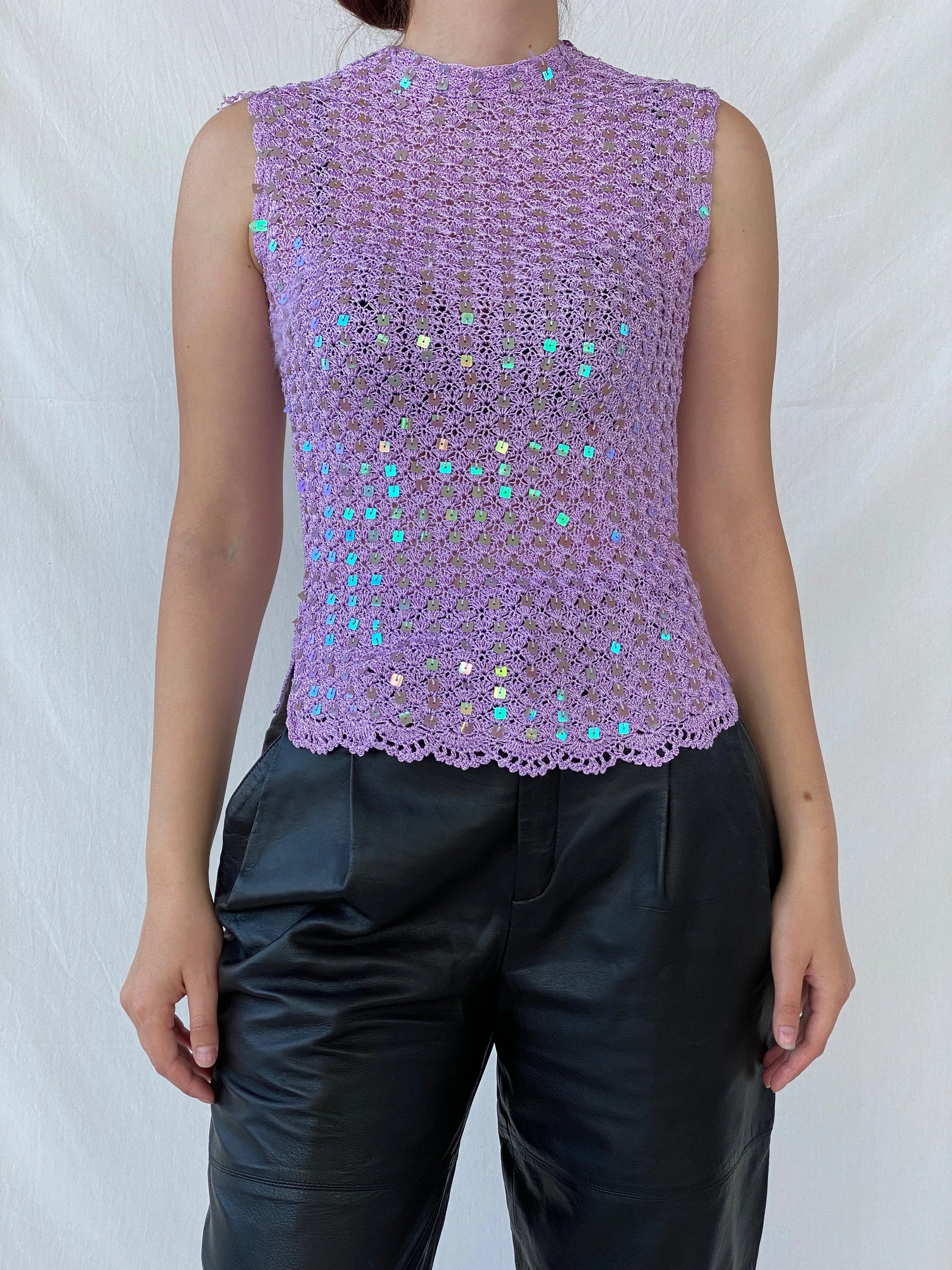 قمة نسائية بدون أكمام من الكروشيه المحاك بالترتر بلون الليلك من التسعينيات - مقاس S