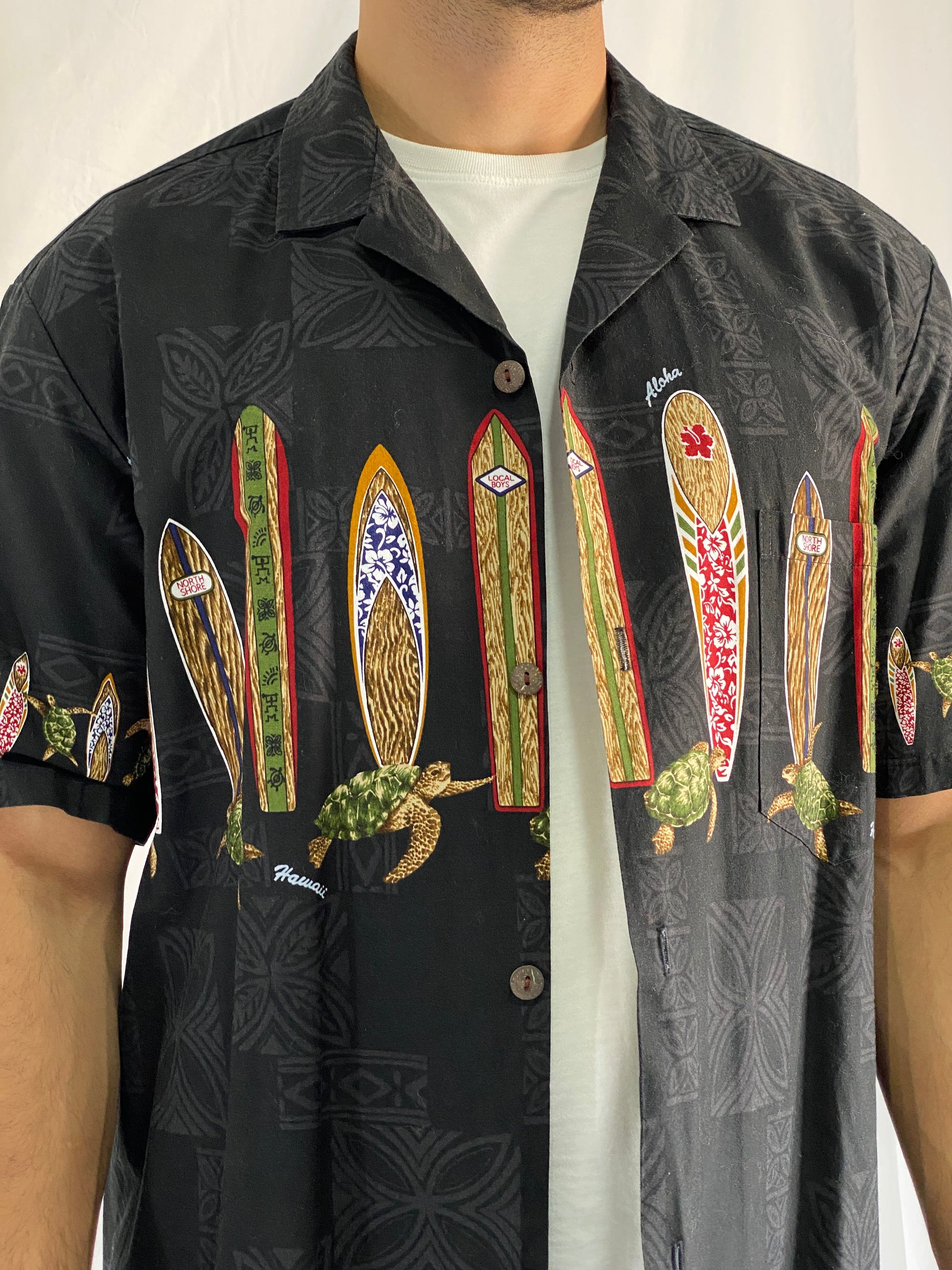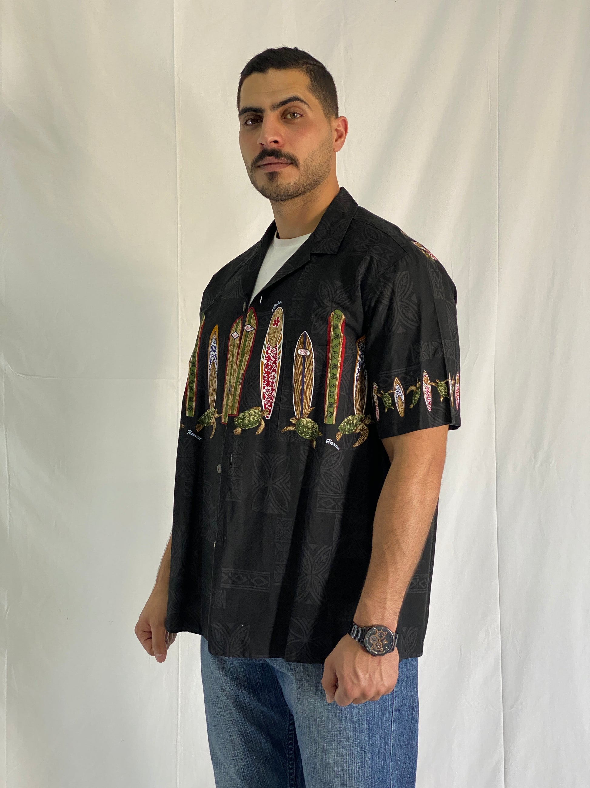 قميص رجالي بأكمام قصيرة من القطن الأسود بطبعة لوح ركوب الأمواج والسلاحف من رويال هاوايان كرييشنز - مقاس XL