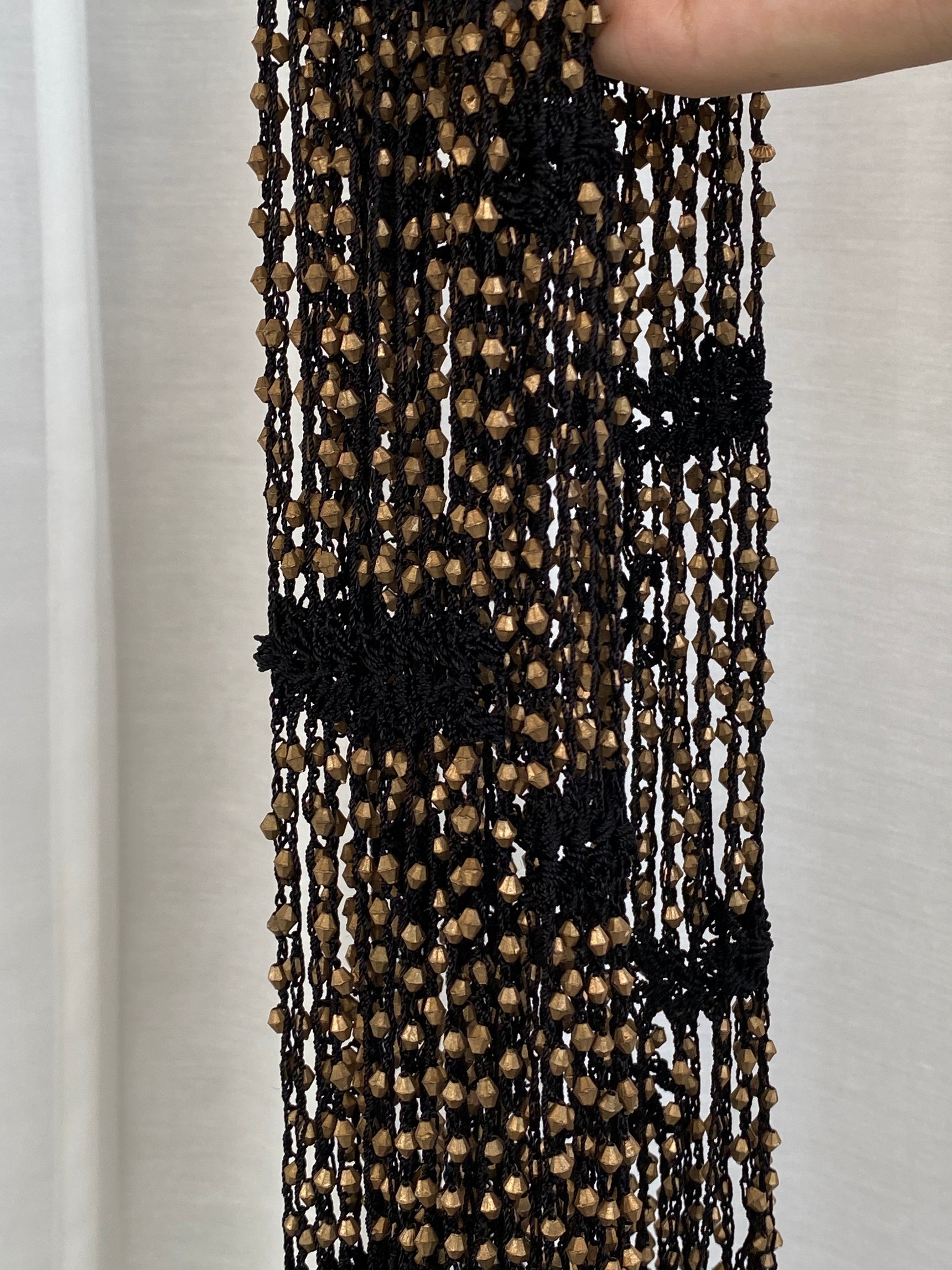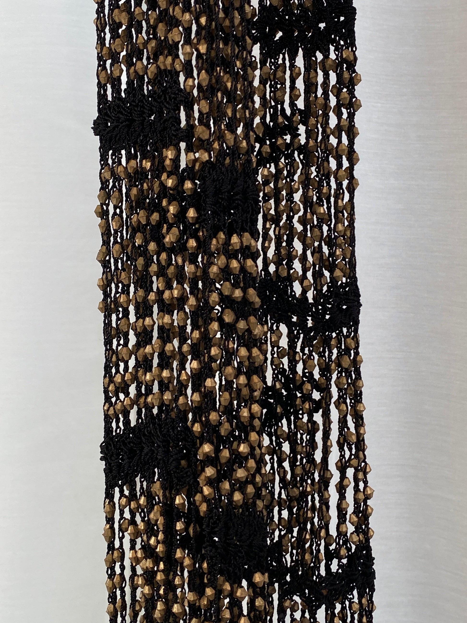 وشاح تريبي أسود كروشيه مزين بالخرز مع شرابات وتزيينات برونزية بيان