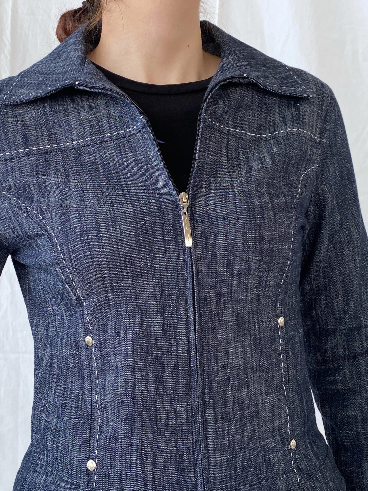 فينتاج 123 بلو قميص نسائي بسحاب من الدنيم مع خياطة بيضاء باللون البحري - مقاس S