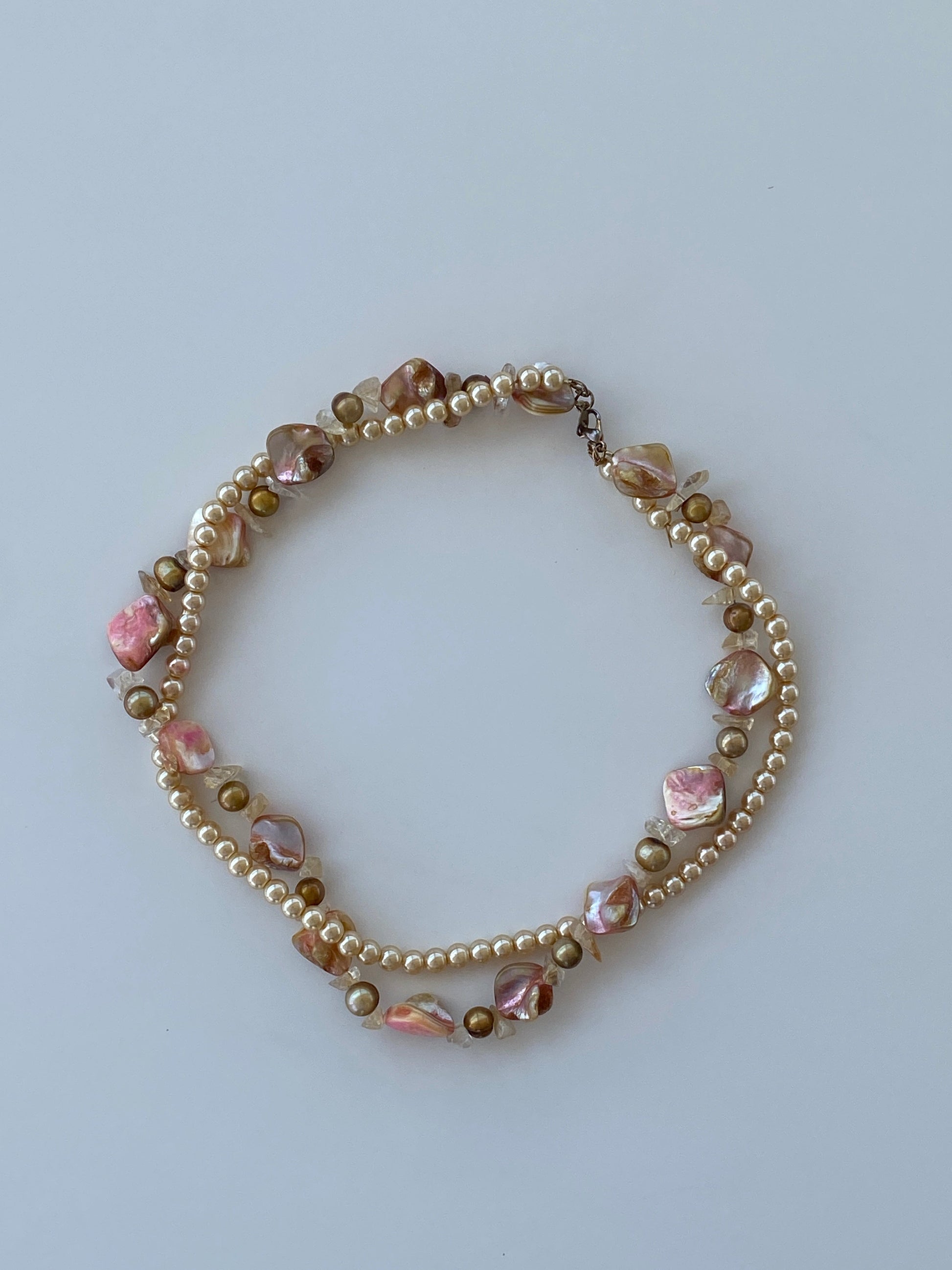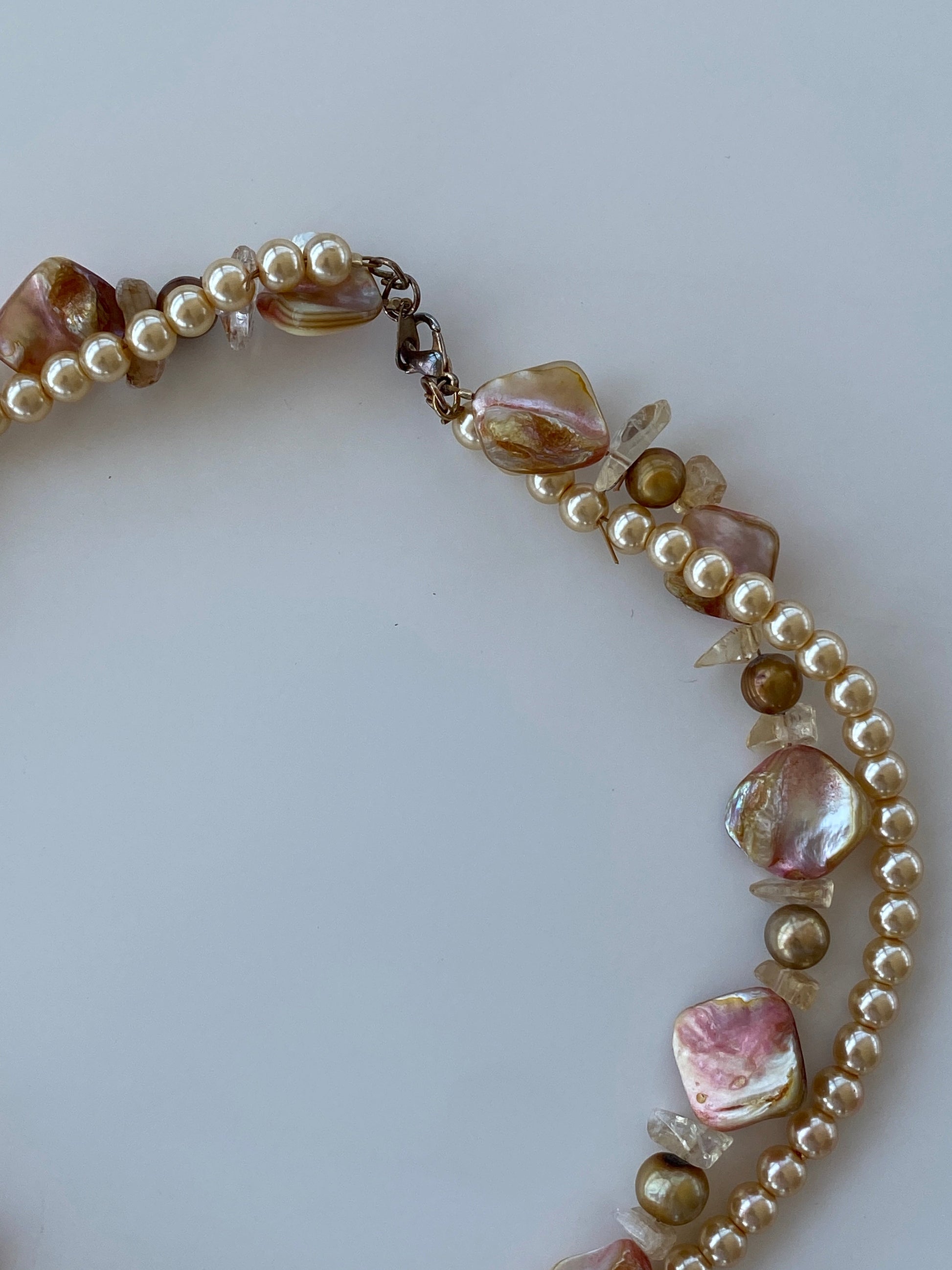 ارتقِ بمظهرك مع هذه القلادة العتيقة ذات اللؤلؤ الباروكي والخرز الصدفي. تتميز بلآلئ صناعية كريمية، وخرز صدفي وردي وذهبي لامع، ولمسات من الأحجار الطبيعية، هذا التصميم ذو الخيطين يجمع بين مزيج فريد من الملمس والأناقة. وزنها الأثقل قليلاً وتفاصيلها المعقدة تجعلها قطعة بارزة حقيقية، مثالية للتنسيق مع الأساليب الكاجوال والمسائية على حد سواء. اكتشاف عتيق خالد لهواة جمع المجوهرات وعشاق الموضة.