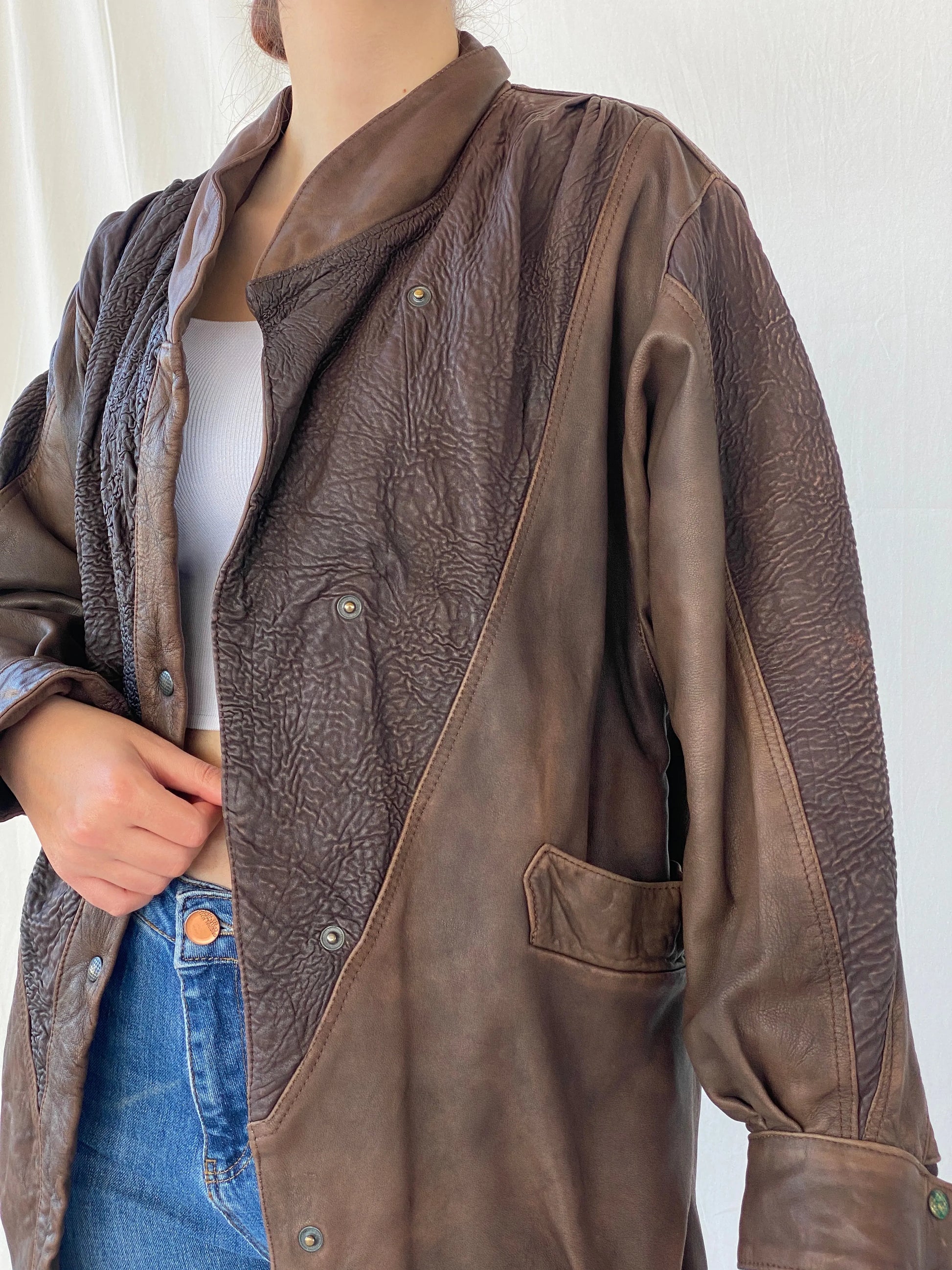 معطف فتاة رعاة البقر بني عتيق من الجلد الطبيعي مع تفاصيل مجعدة - M
