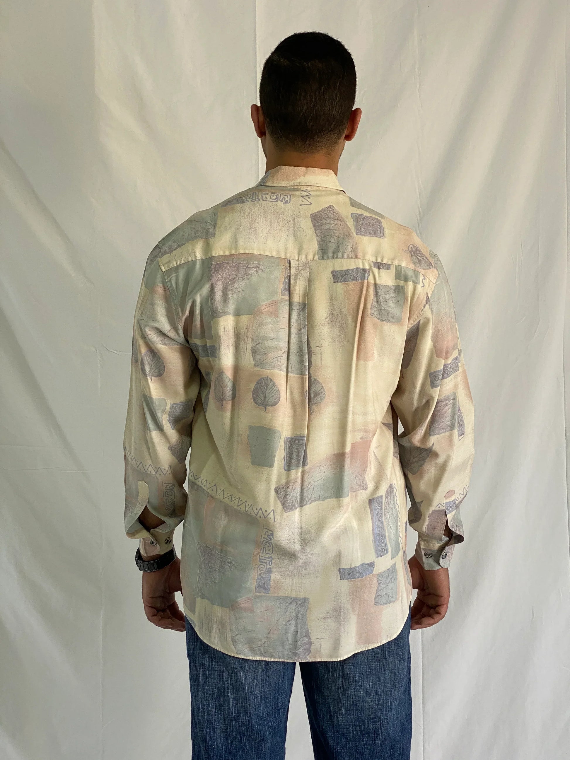 قميص رجالي بأكمام طويلة بطبعة أوراق بيج تجريدية من نادي دامينغو العتيق 90s - مقاس L