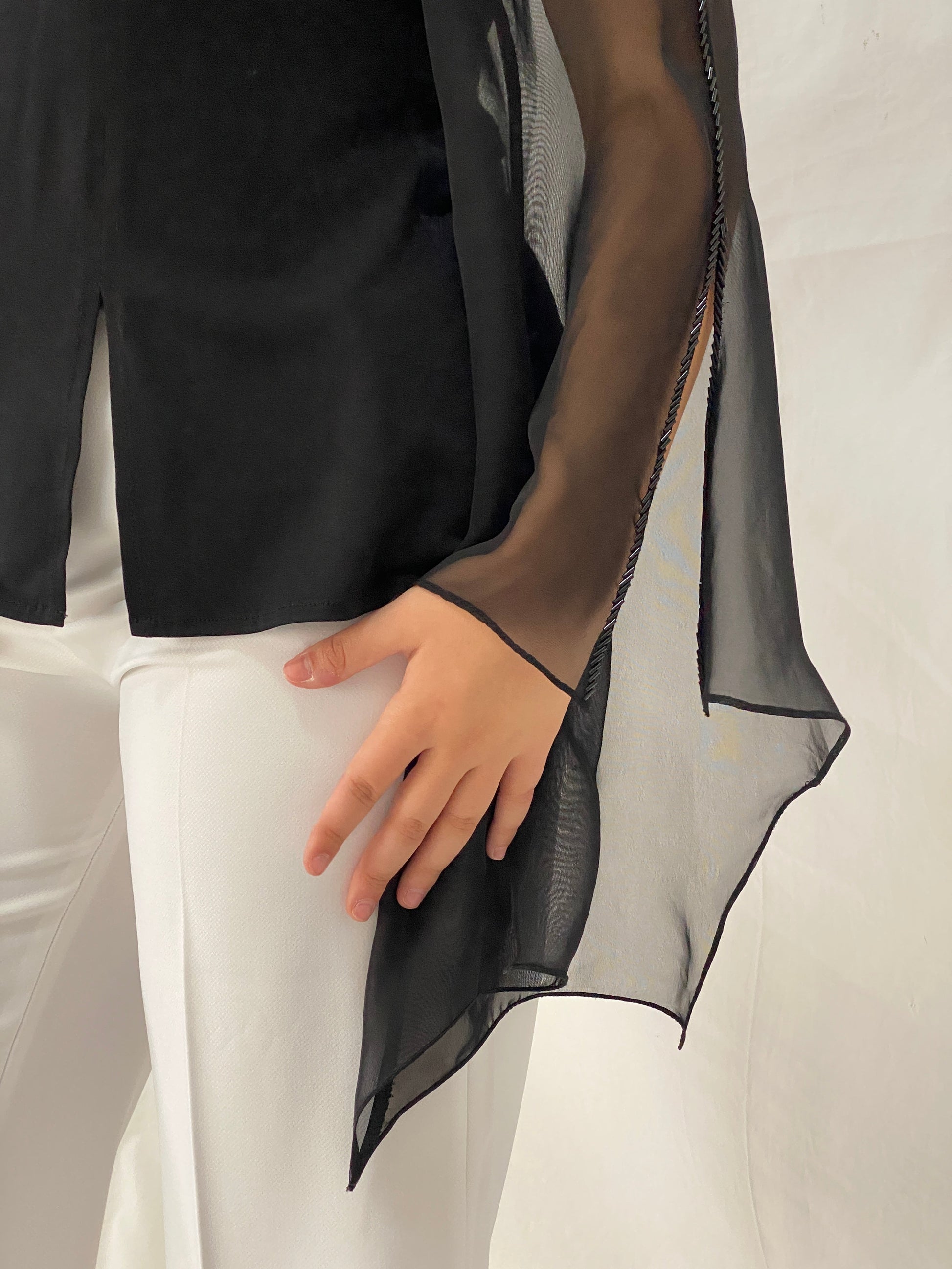 Stunning Vintage DORCA Black Top with Dramatic Sheer Beaded Sleeves - L