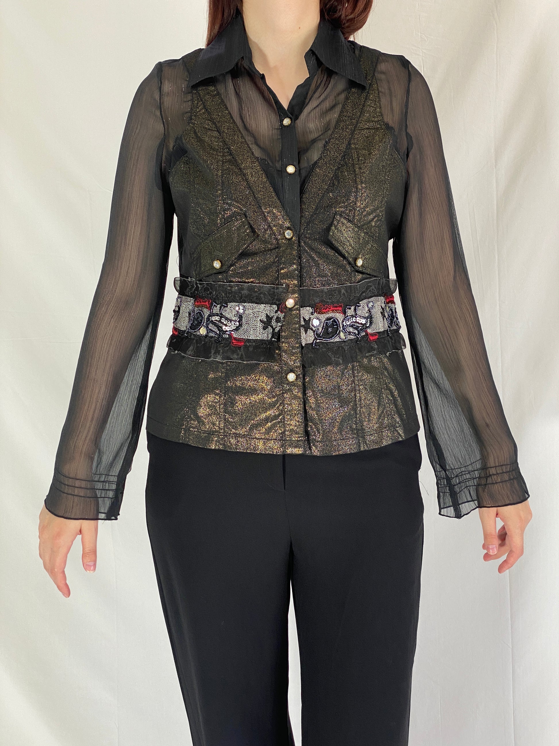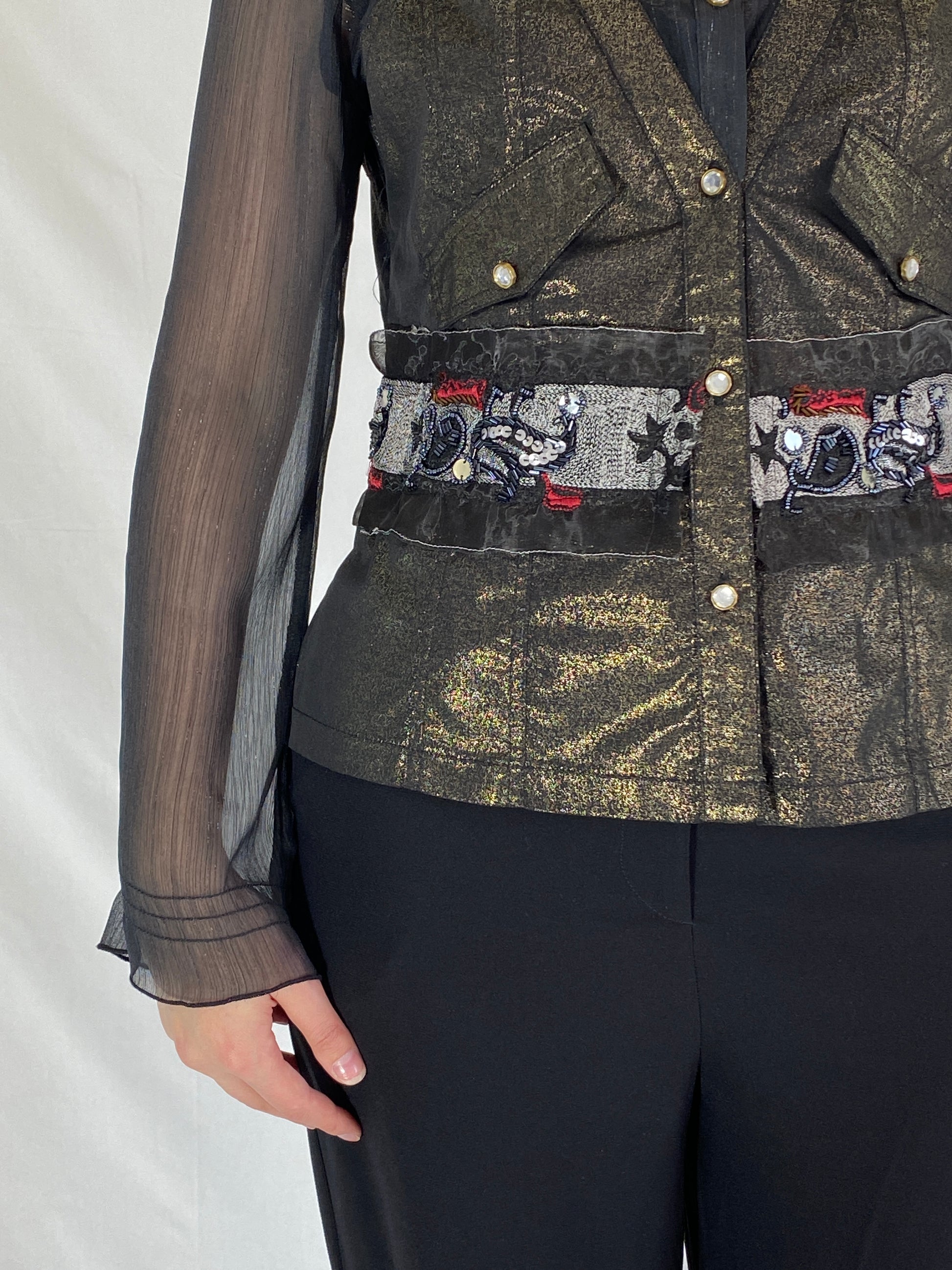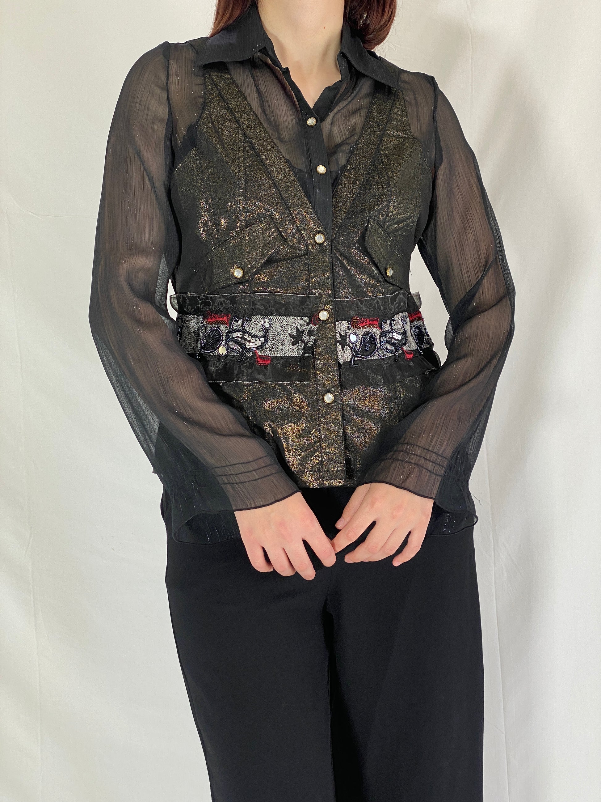 اصنعي بيانًا مع هذه البلوزة العتيقة من فارفالا روسو، مزيج خيالي من الجاذبية القوطية ولمعان Y2K. مصممة من قماش أسود شفاف مع طبقة ذهبية معدنية، يتميز هذا القميص بأزرار لؤلؤية، جيوب مزيفة بغطاء، وحزام خصر مزين بالخرز بتصاميم زهرية بالفضي والأحمر والأسود.