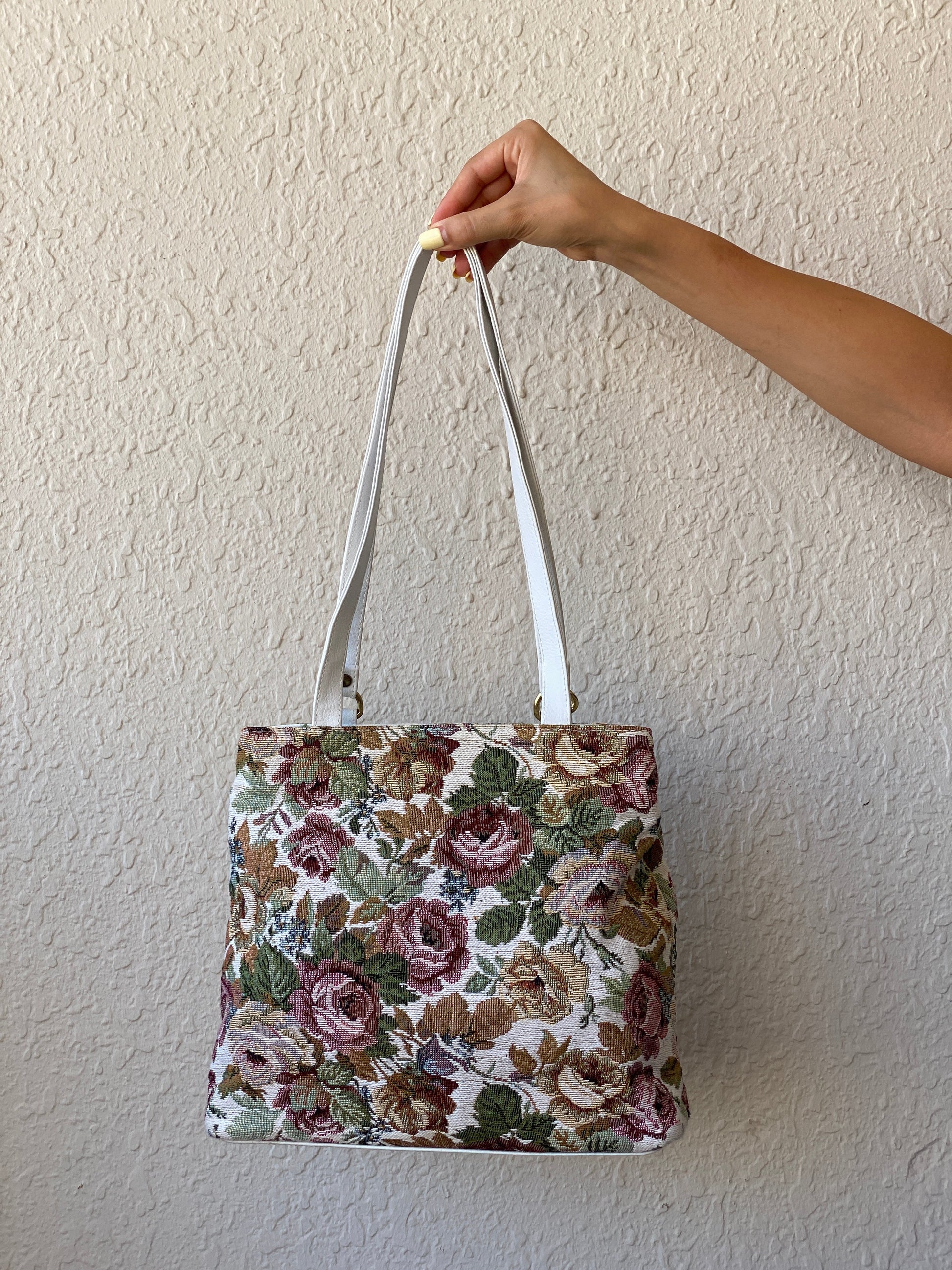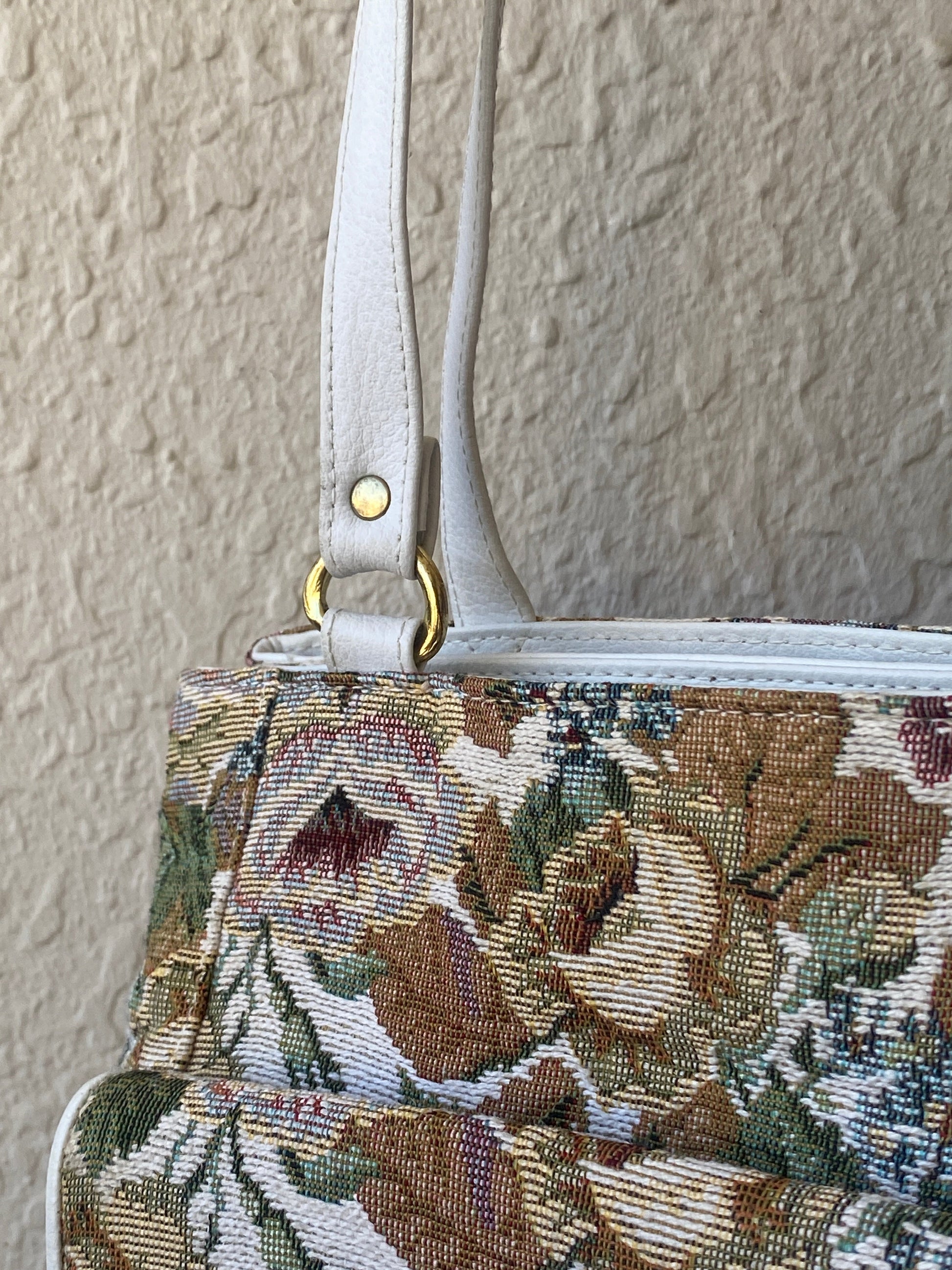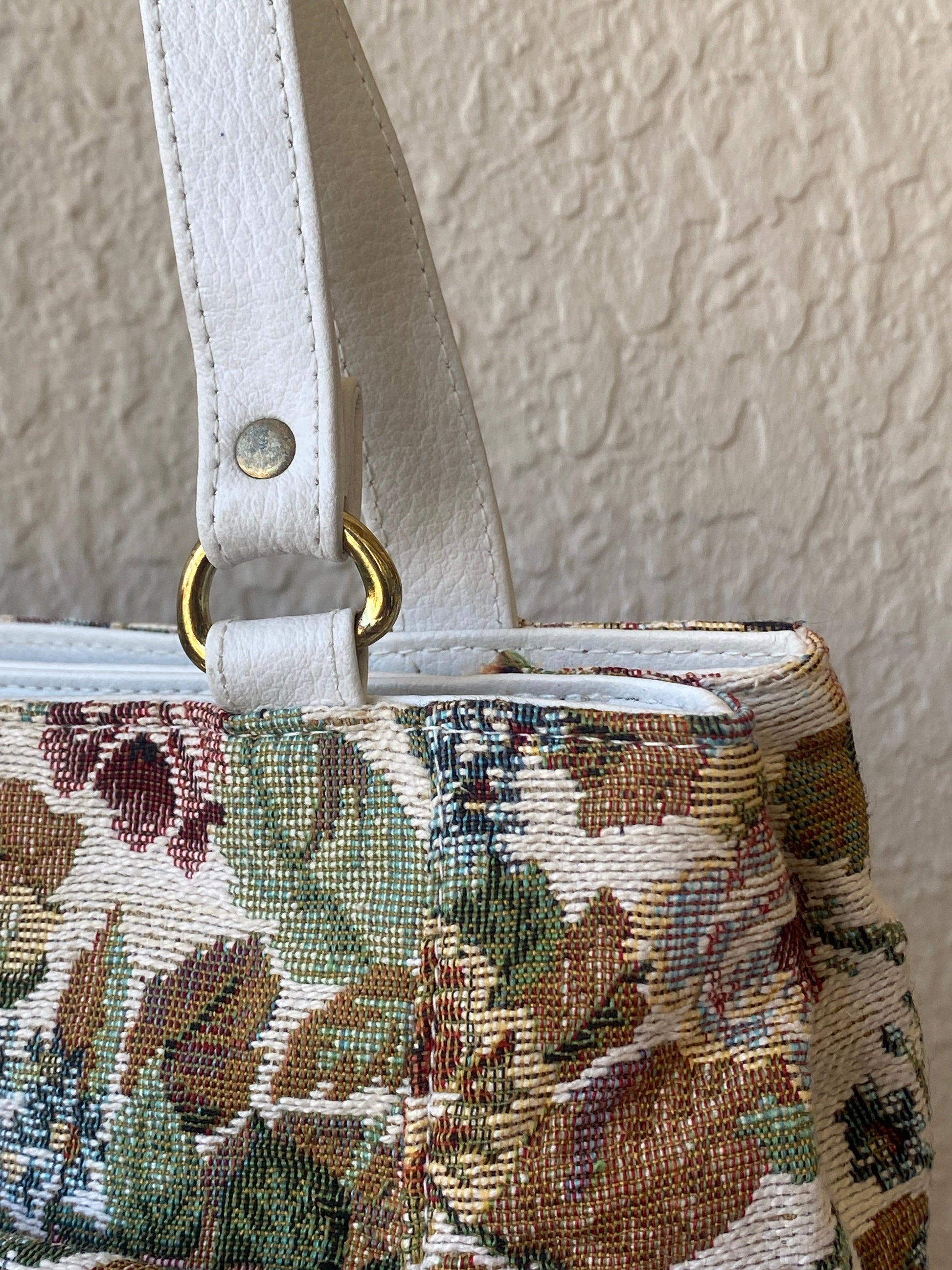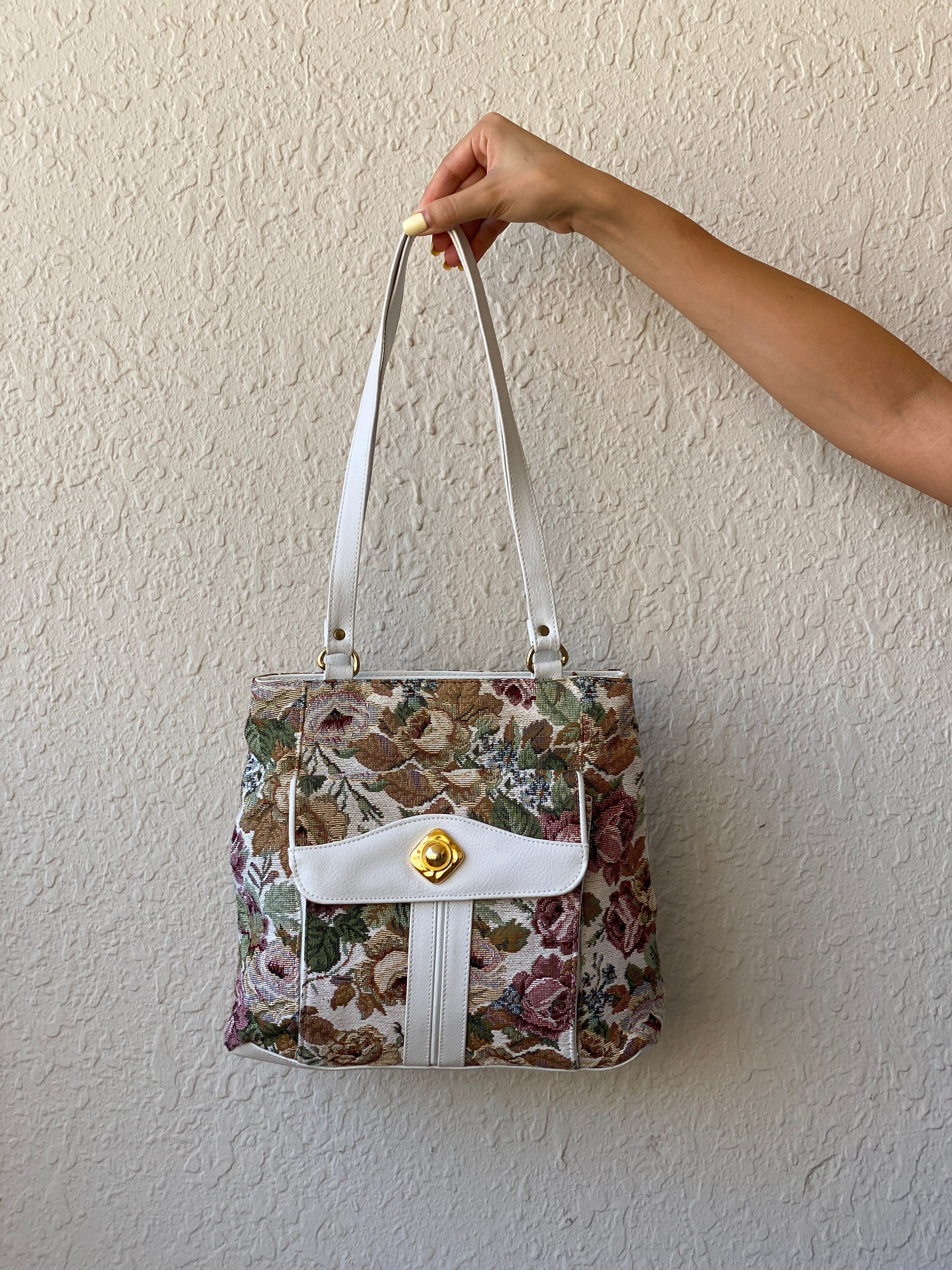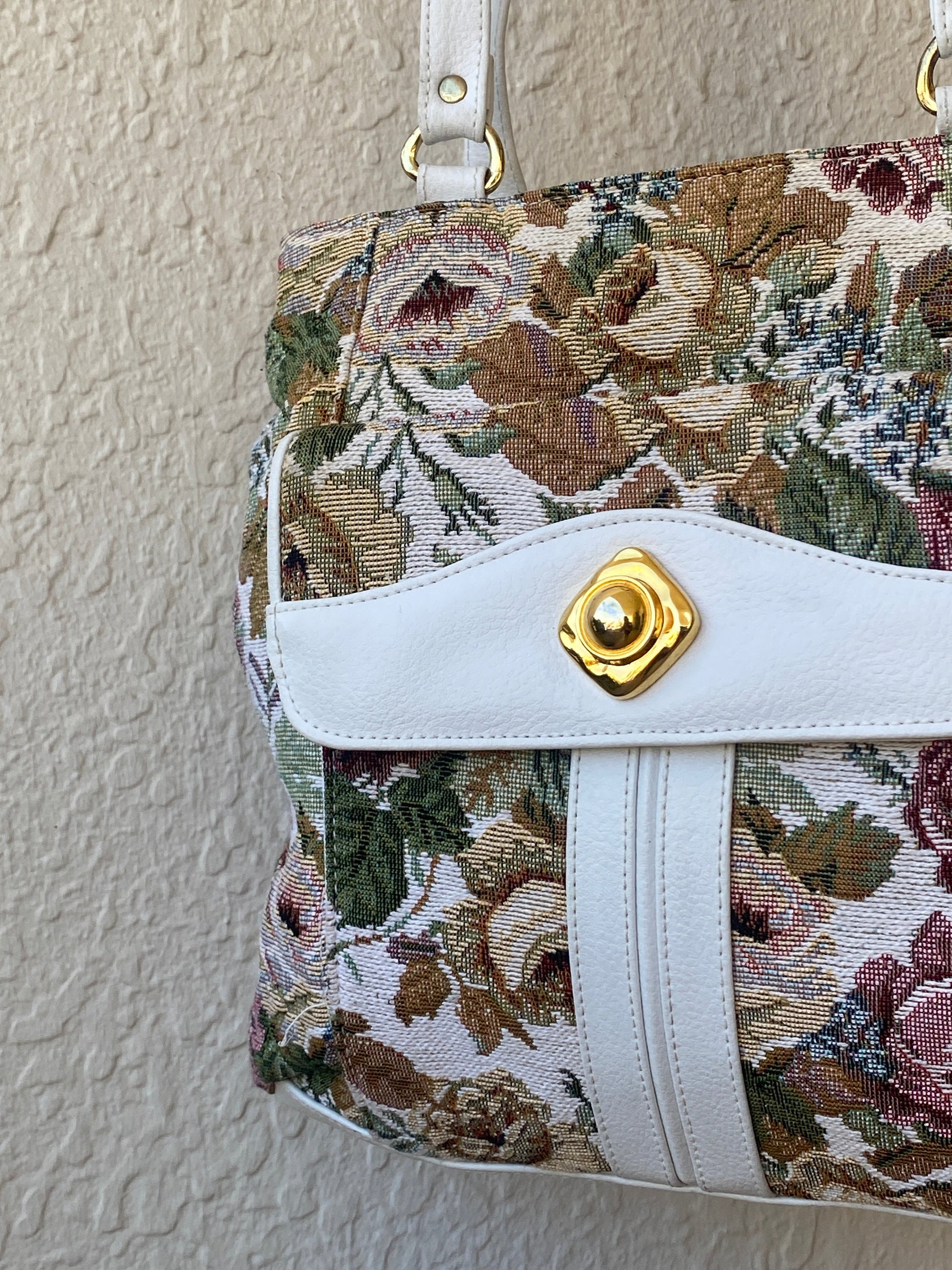 ارتقِ بأسلوبك الكلاسيكي مع حقيبة الكتف المزخرفة بنقشة حديقة الورود الرومانسية بألوان دافئة وترابية. مزينة بحواف من الجلد الصناعي الأبيض النقي، وقفل لولبي ذهبي اللون، وأشرطة كتف مزدوجة رفيعة لتصميم خالد. مثالية لإضافة لمسة من السحر الرجعي إلى إطلالاتك اليومية أو كإكسسوار بارز للمناسبات الخاصة. الداخل الواسع يتسع لكل مستلزماتك مع الحفاظ على أناقتك بسهولة.