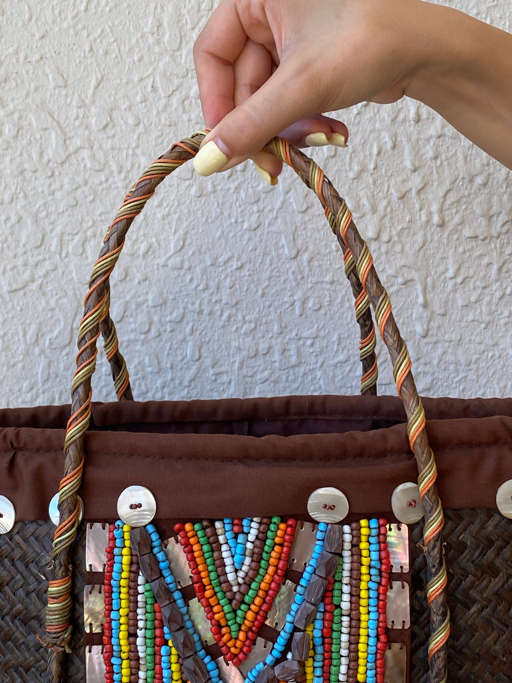 حقيبة شاطئ من القش المنسوج يدوياً بتفاصيل قبلية مزينة بالخرز وزخارف من الأصداف