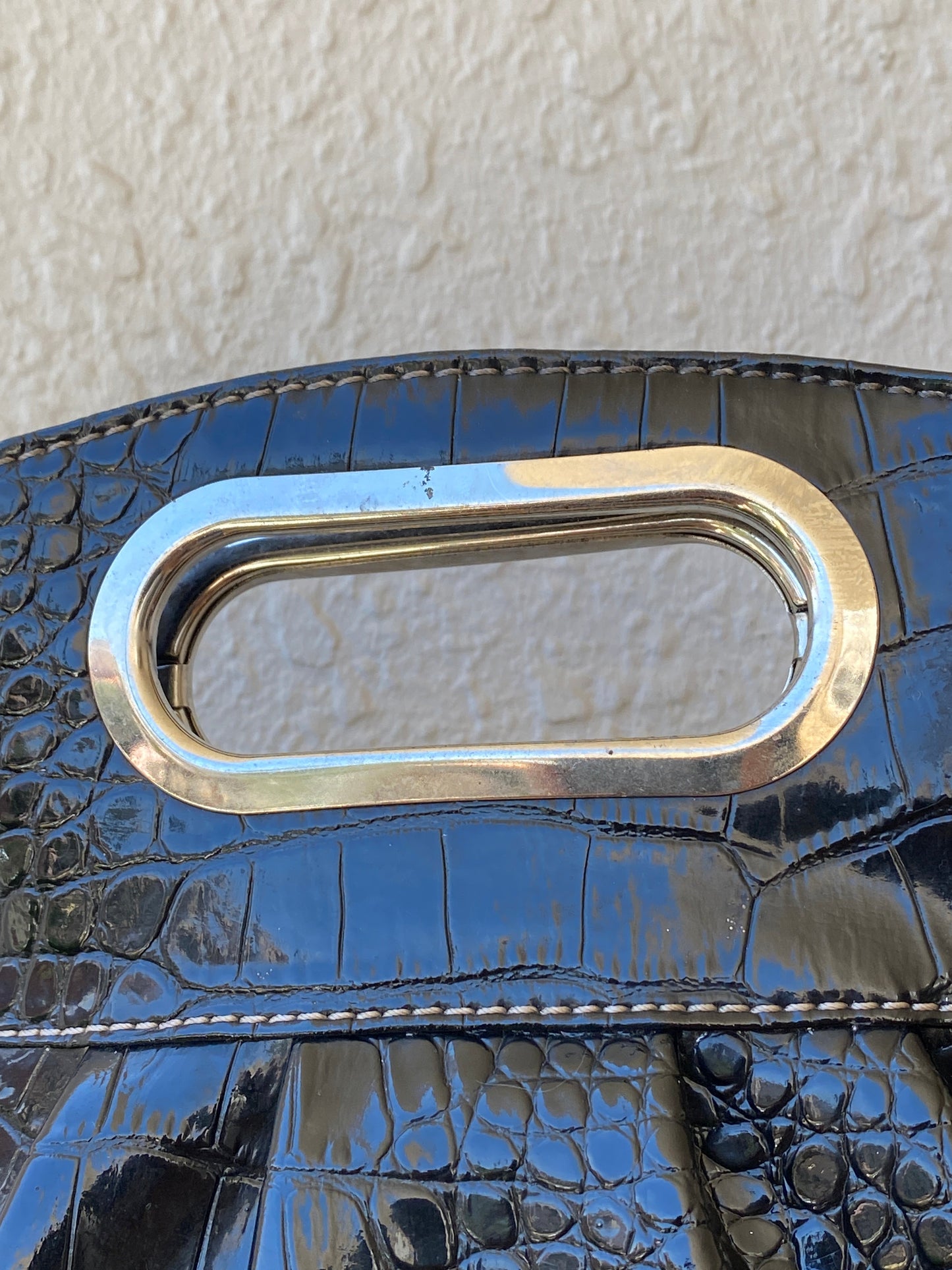 هذا الكلاتش العتيق من Nine West أنيق، منظم، وجاهز ليترك انطباعًا — مصنوع من PVC بنقشة التمساح اللامعة، مما يمنحه إحساس الجلد اللامع الفاخر دون الوزن الثقيل. المقبض المقطوع المعدني الفريد يجعله أنيقًا وعمليًا في آنٍ واحد.