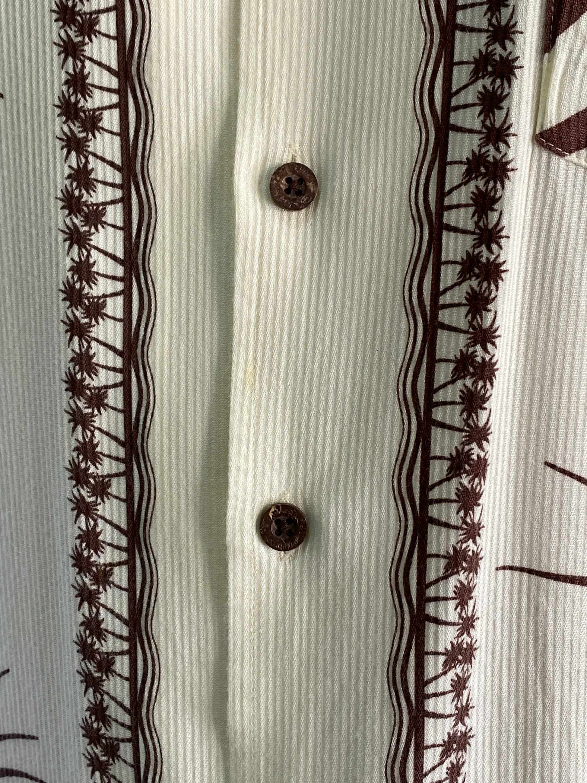 استشعر أجواء الجزيرة الهادئة مع هذا القميص قصير الأكمام العتيق من Quiksilver المصنوع من قماش رايون كريمي ناعم. يتميز بطبعة قبلية تجريدية بنية مستوحاة من النخيل تغطيه بالكامل، مع أزرار تشبه جوز الهند، وجيب صدري، وقصة مريحة مثالية لأيام الصيف أو لحظة استرجاع أسلوب Y2K. تضيف خطوط الخياطة العمودية ملمساً وجمالية رجعية، بينما يجعل المقاس XL منه مثالياً للارتداء مفتوحاً فوق قميص داخلي أو مزركشاً مع الجينز.