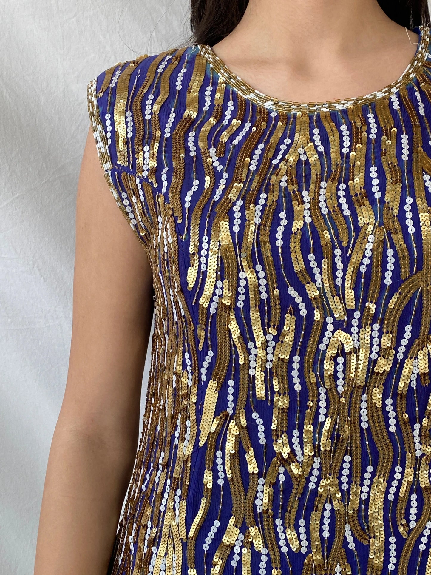 نقدم لكم فستان Vintage Razzle Dazzle Pure Silk Blue Gold Sequin Boxy Midi. مصنوع بتطريزات لامعة من الترتر والتطريز بالخرز، هذا الفستان سيجذب الأنظار بلا شك. بتصميمه الأنيق وتفاصيله المزخرفة، ستشعر بالثقة والأناقة في هذا الفستان المميز.