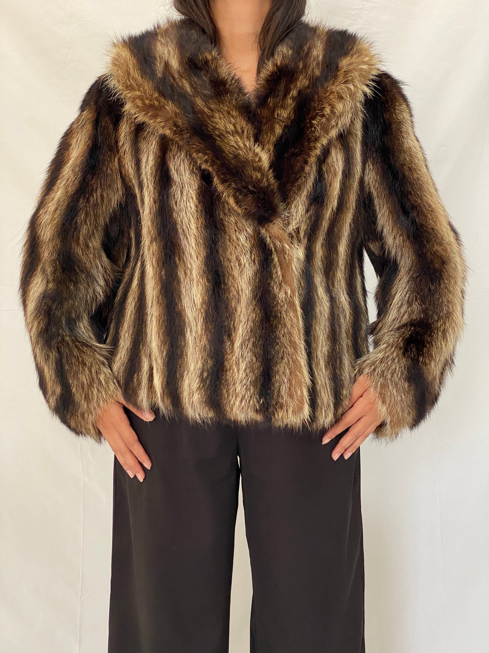 Vintage fur jacket, raccoon fur coat, real fur winter coat, striped fur coat, genuine fur jacket, 70s glam coat, vintage brown fur, statement outerwear, luxury vintage, retro winter jacket, authentic fur jacket, Balagan Vintage