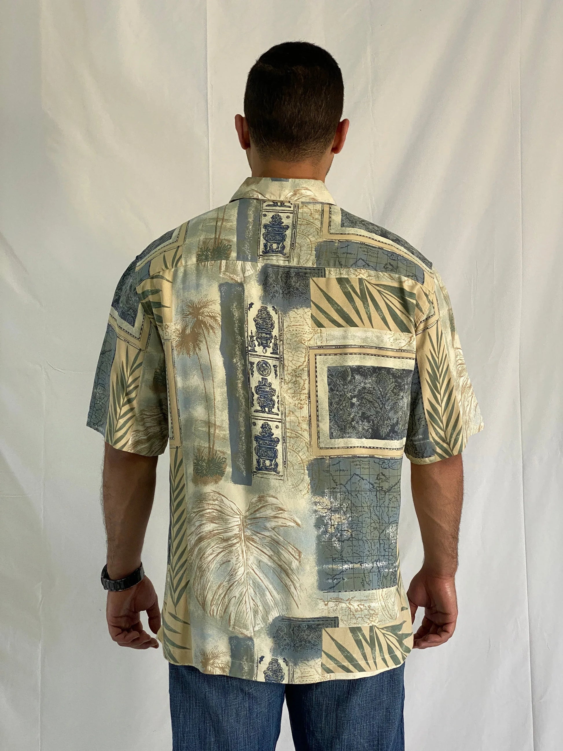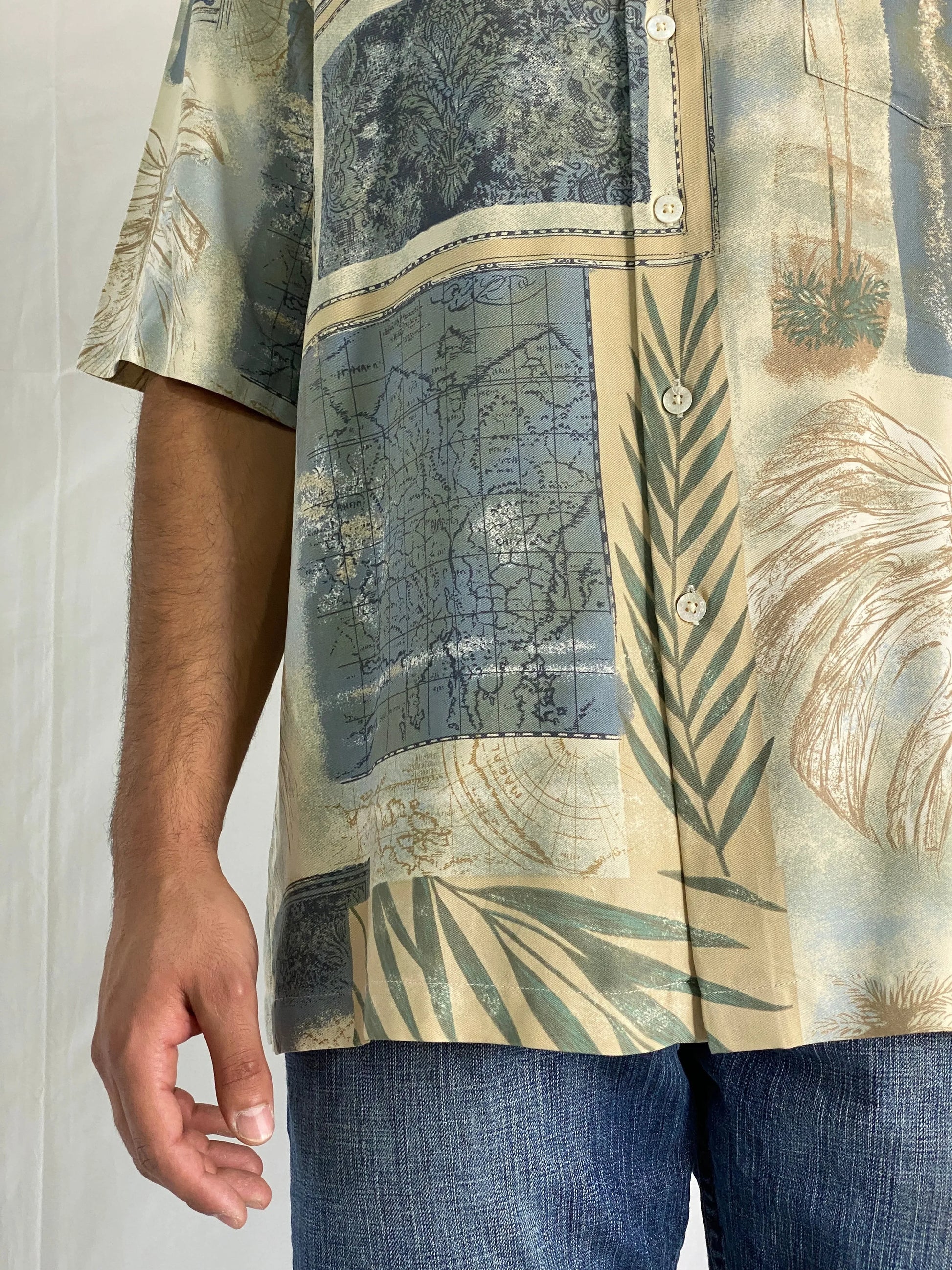 قميص رجالي من الحرير بطبعة نخيل وخرائط هاواي من توري ريتشارد العتيق - مقاس L