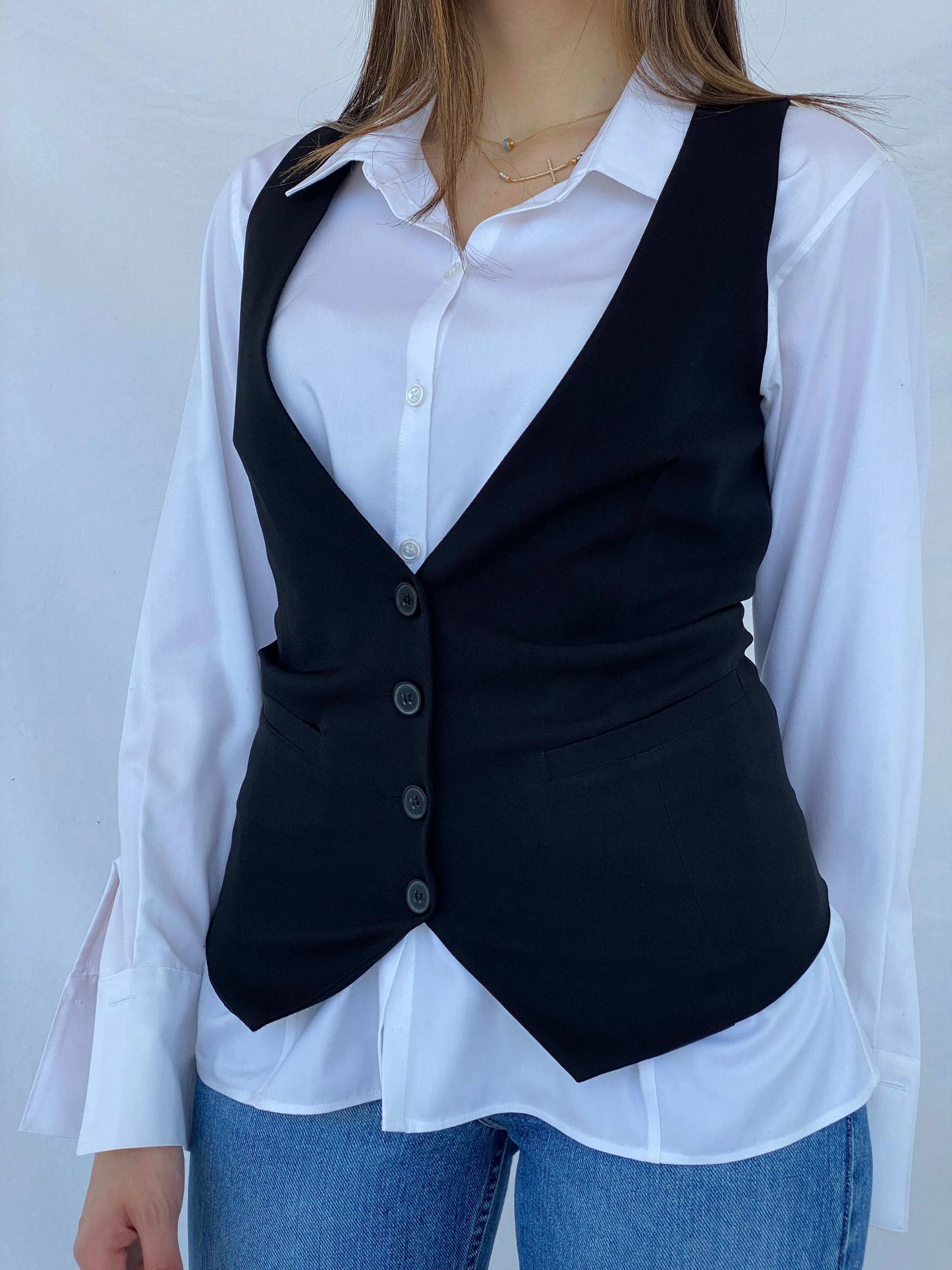 تقديم صديري Vintage Y2K الأسود بأزرار - قطعة لا غنى عنها لأي محترف مهتم بالموضة! ارتقِ بإطلالتك المكتبية مع هذا الصديري العصري والأنيق في الوقت نفسه. مثالي لإضافة لمسة من الأناقة إلى خزانة ملابسك العملية. لا تفوت هذه القطعة الكلاسيكية.