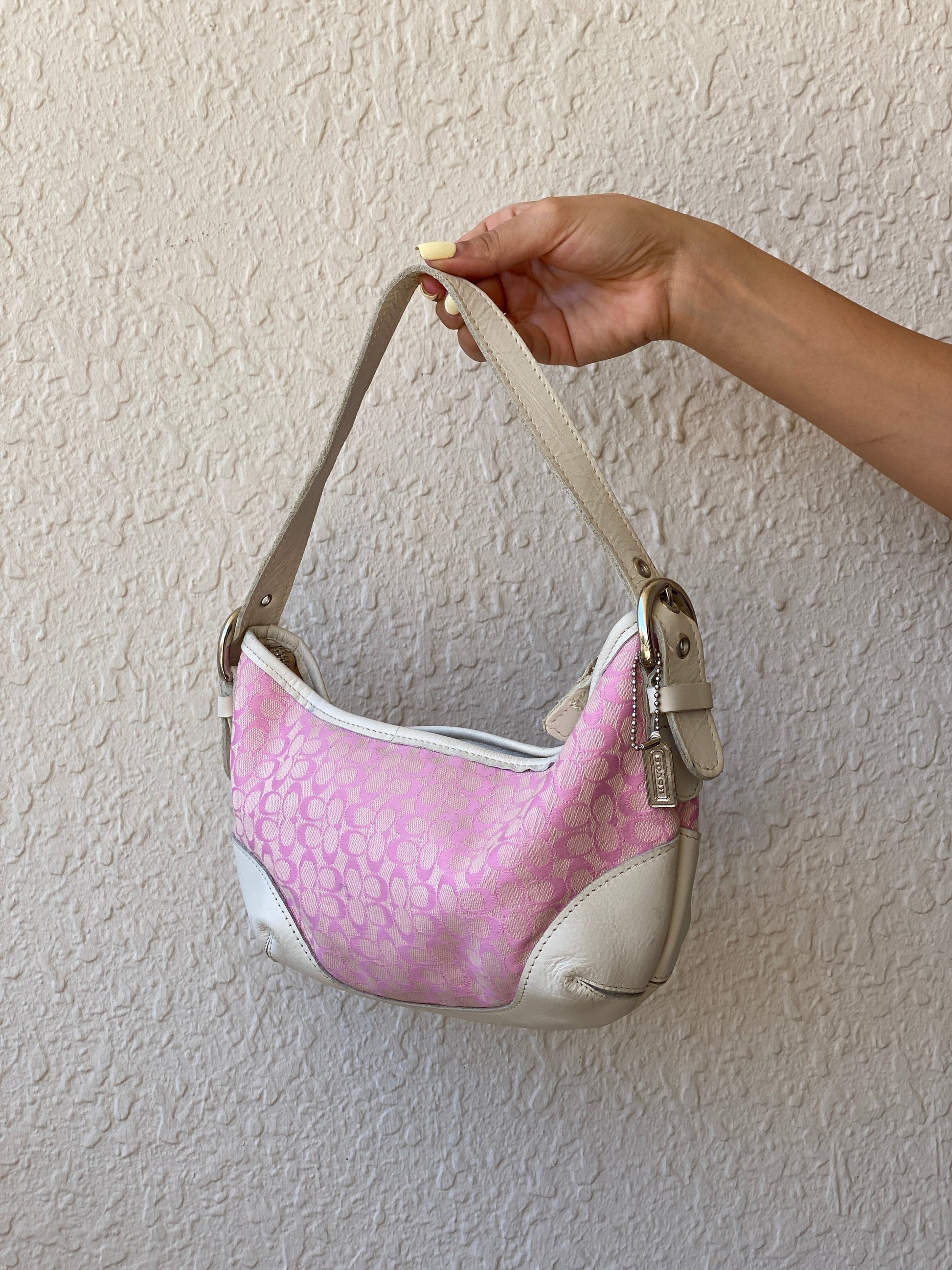 أضف لمسة من سحر Y2K إلى مجموعتك مع حقيبة الكتف الصغيرة الكلاسيكية من Coach. مصنوعة من قماش جاكار Signature C الأيقوني بلون وردي وعاجي نادر، هذه القطعة هي كنز حقيقي من أوائل الألفينات. مثالية للتنسيق مع الجينز منخفض الخصر والتيشيرتات الصغيرة، إنها قطعة لا غنى عنها لأي محب لـ Y2K. لا تفوت هذه القطعة الفريدة - بمجرد أن تُباع، لن تعود!