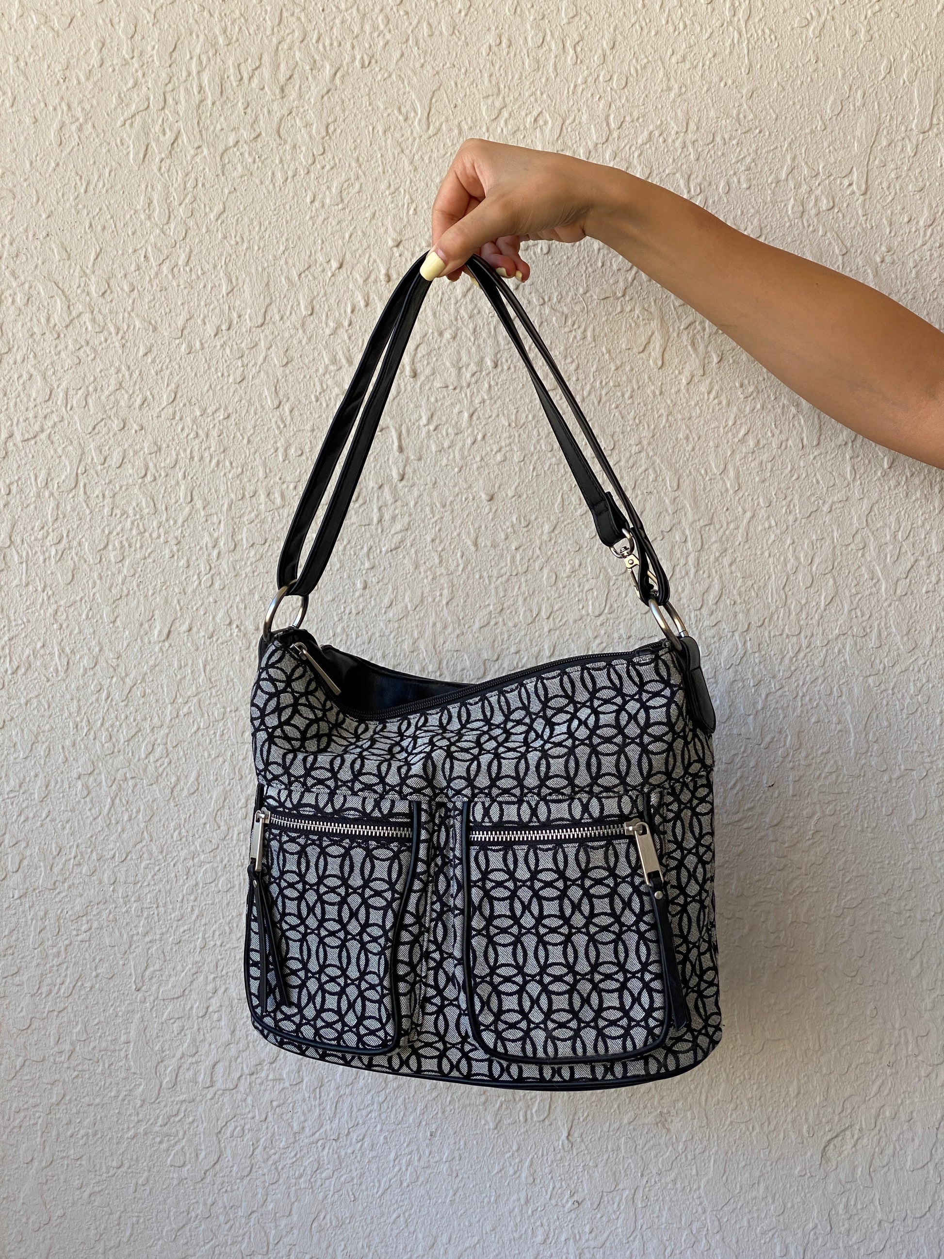 حقيبة كتف أنيقة وواسعة وعملية للغاية — تتميز بطباعة جريئة من الدوائر الهندسية باللونين الأسود والأبيض وبهيكل ناعم ومنظم. مع جيبيها الأماميين بسحاب مزدوج، هذه الحقيبة مثالية للاستخدام اليومي، السفر، أو التنقلات العملية.