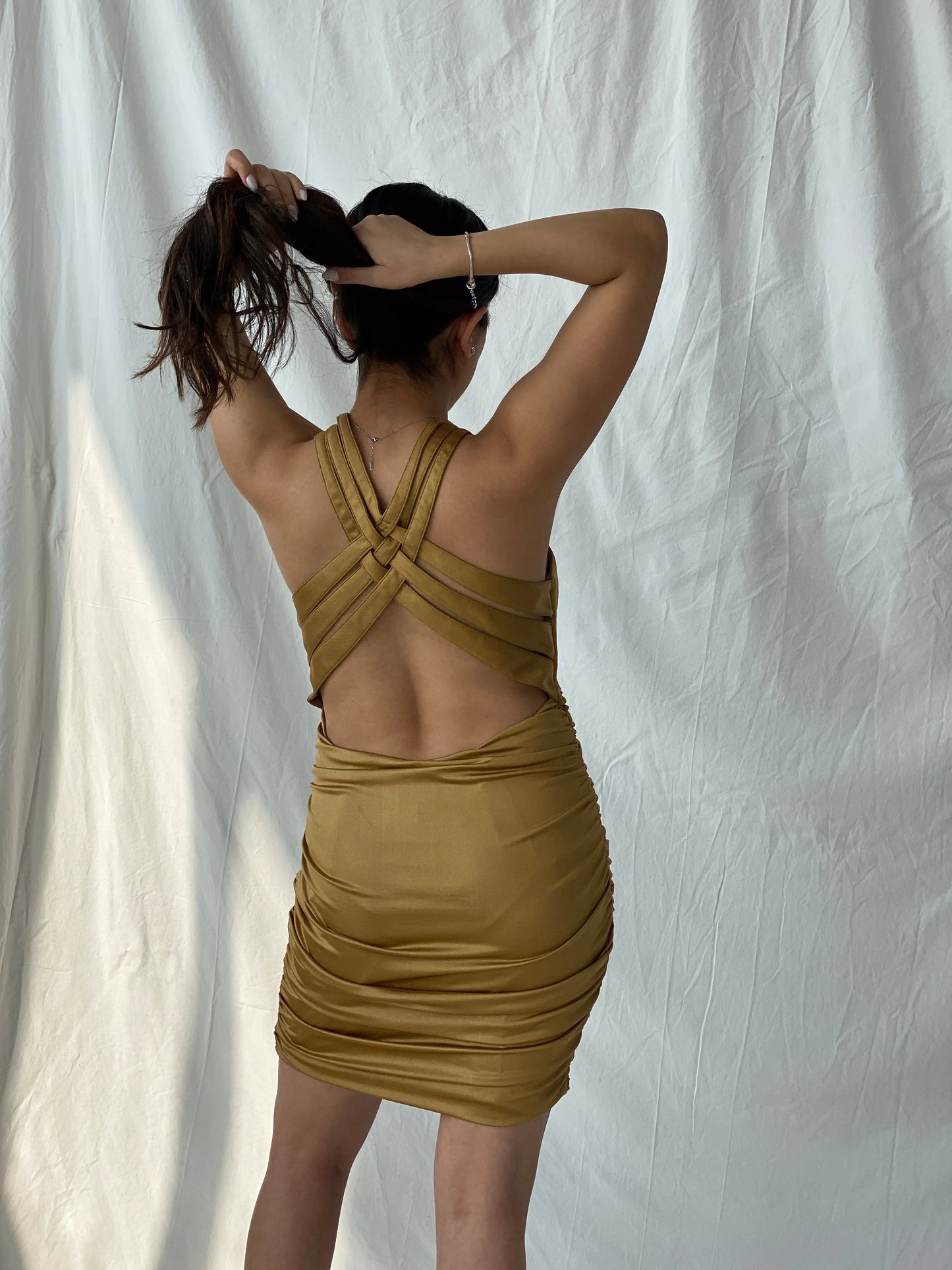 Y2K La Femme Bronze Gold Halter Neck Bodycon Mini Dress - M