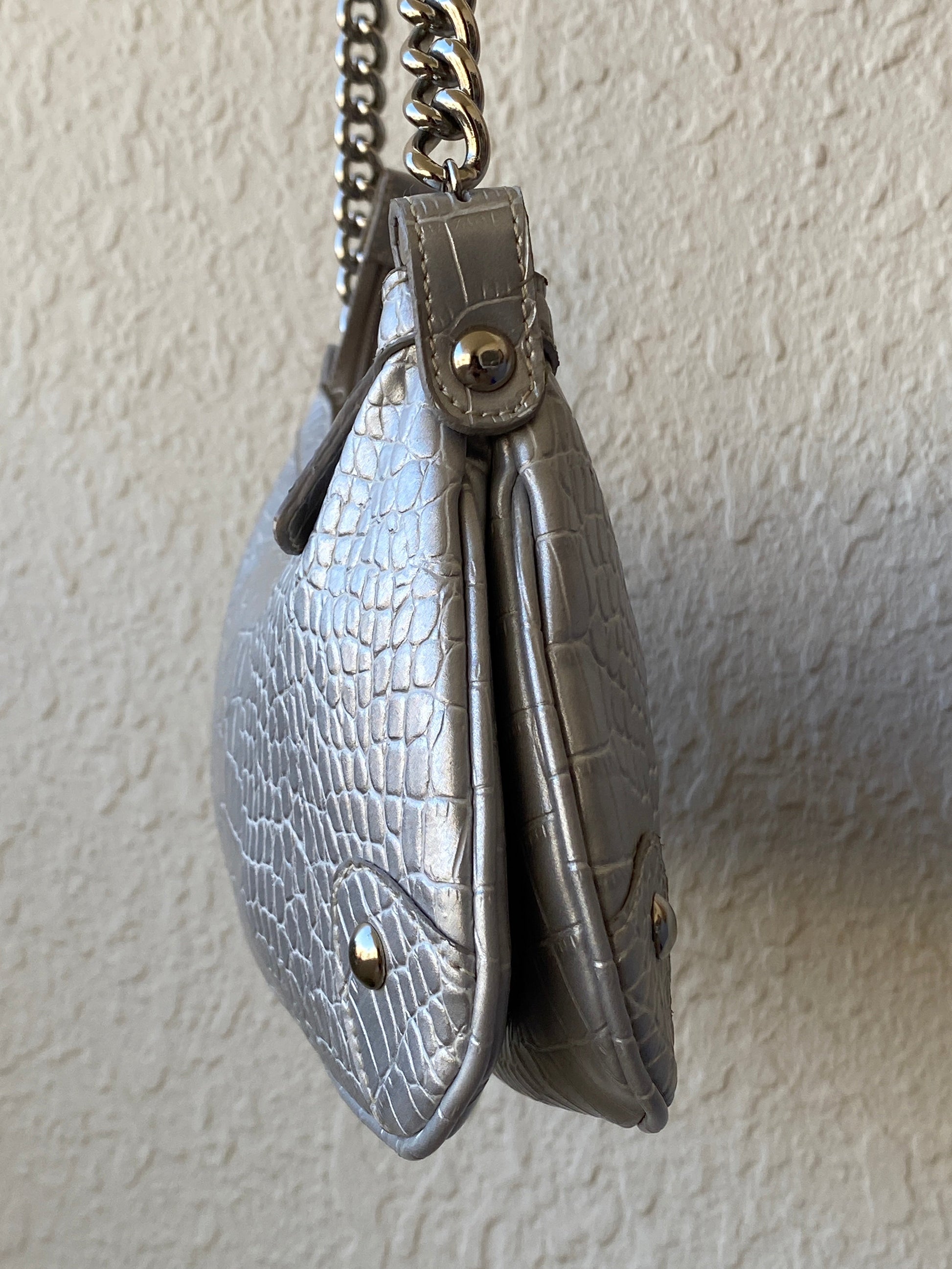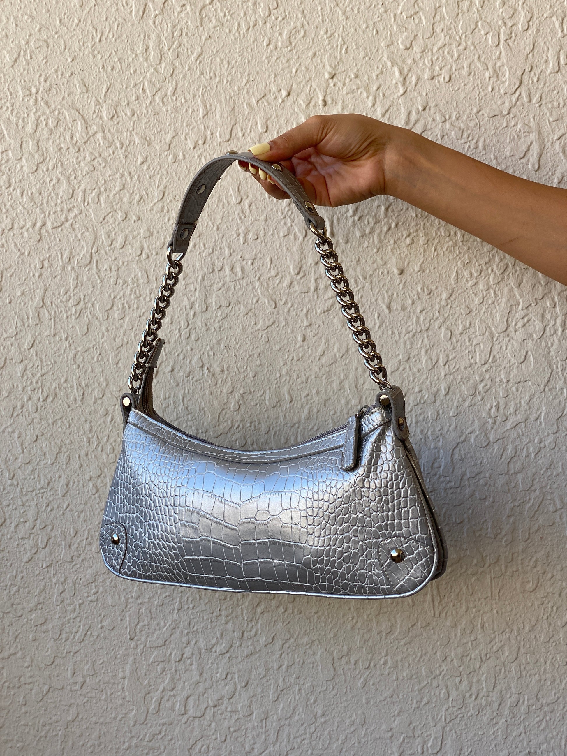 حقيبة كتف فضية من ناين ويست بنقش تمساح – حقيبة بسلسلة Y2K