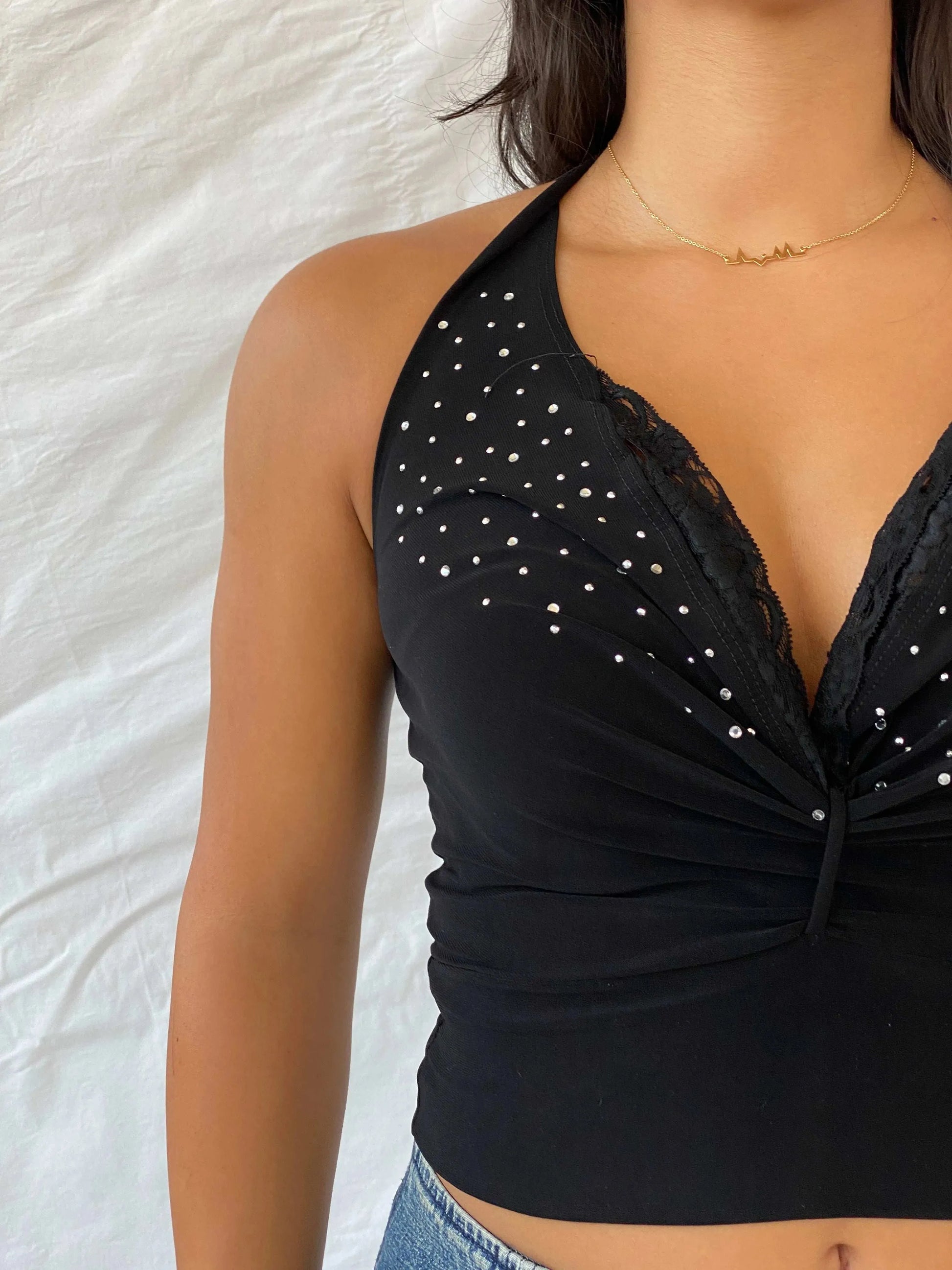 Vintage 00s USA VIZIO Beaded Black Halter Top With Lace Details - S