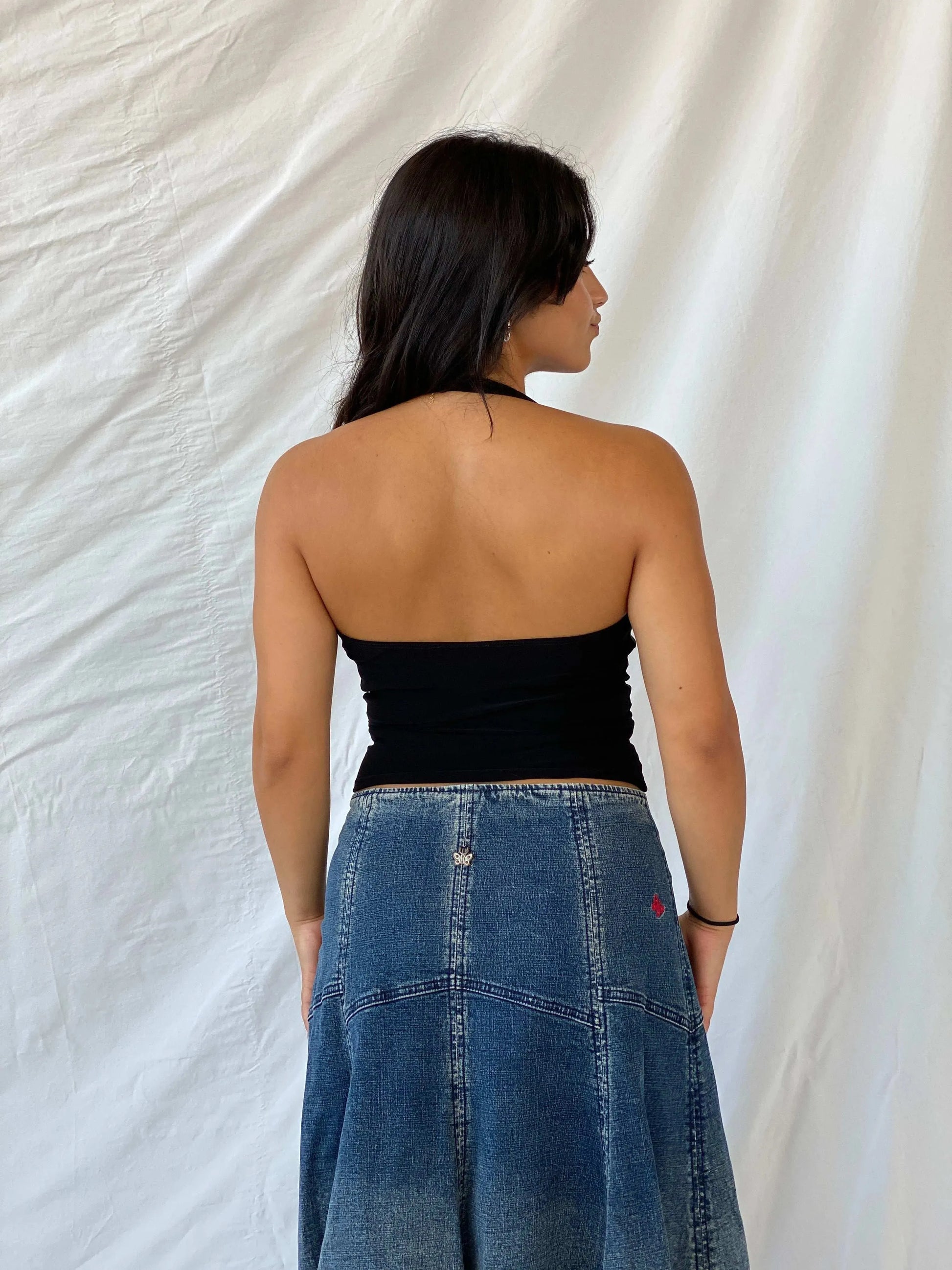 قمة هالتر سوداء مزينة بالخرز من فيزيو الأمريكية 00s مع تفاصيل من الدانتيل - S