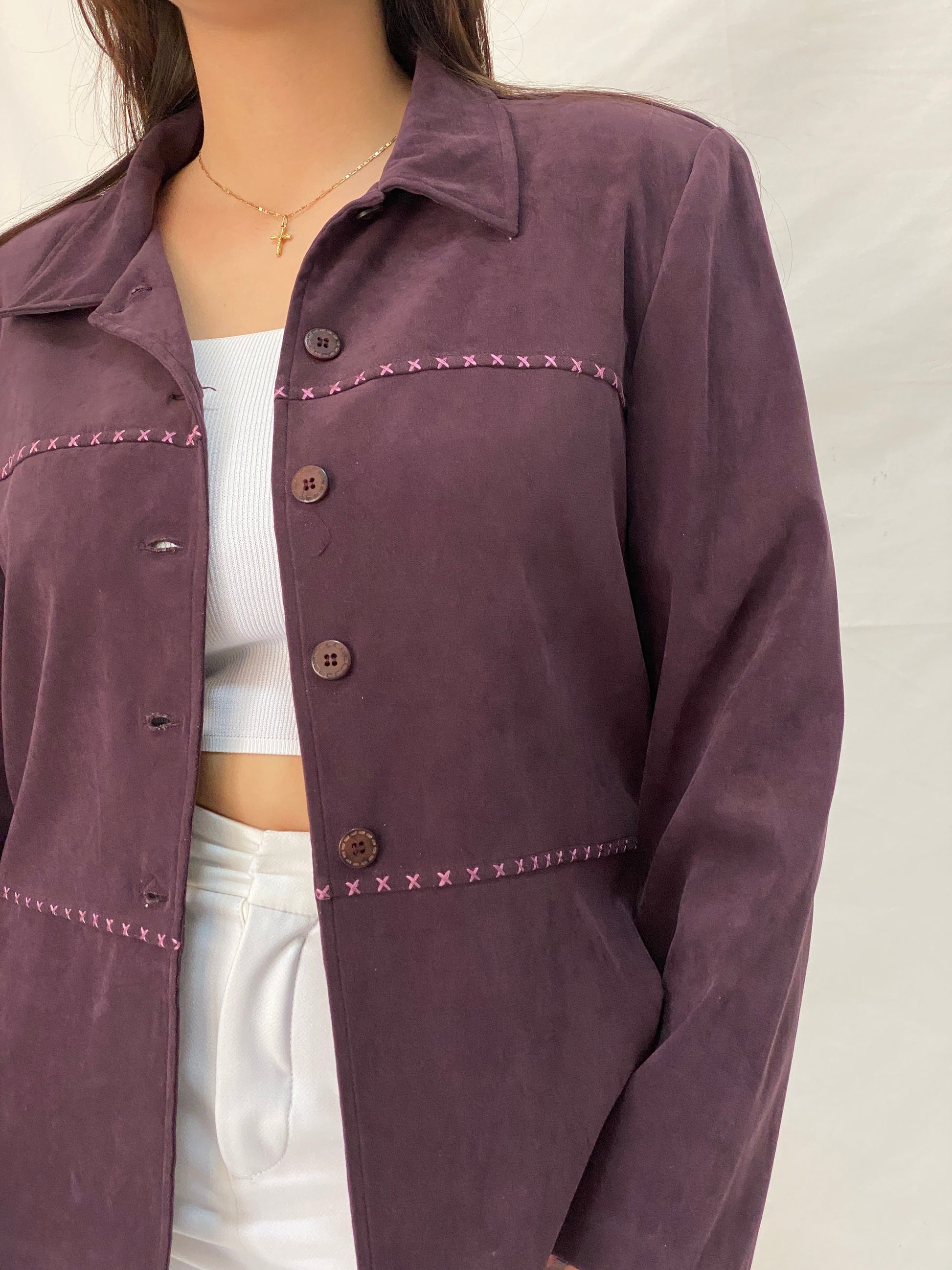 R&K Originals, Faux Suede Jacket, Faux Suede Shirt, Purple Jacket, Plum Shirt, Button-Up Jacket, Vintage R&K, 90s, Y2K, Retro, Cross-Stitch, Pink Stitching, Embroidery Detail, Suede-look, Lightweight Jacket, Shacket, Vintage, Grunge, Cottagecore, Boho, Western, Collared Shirt