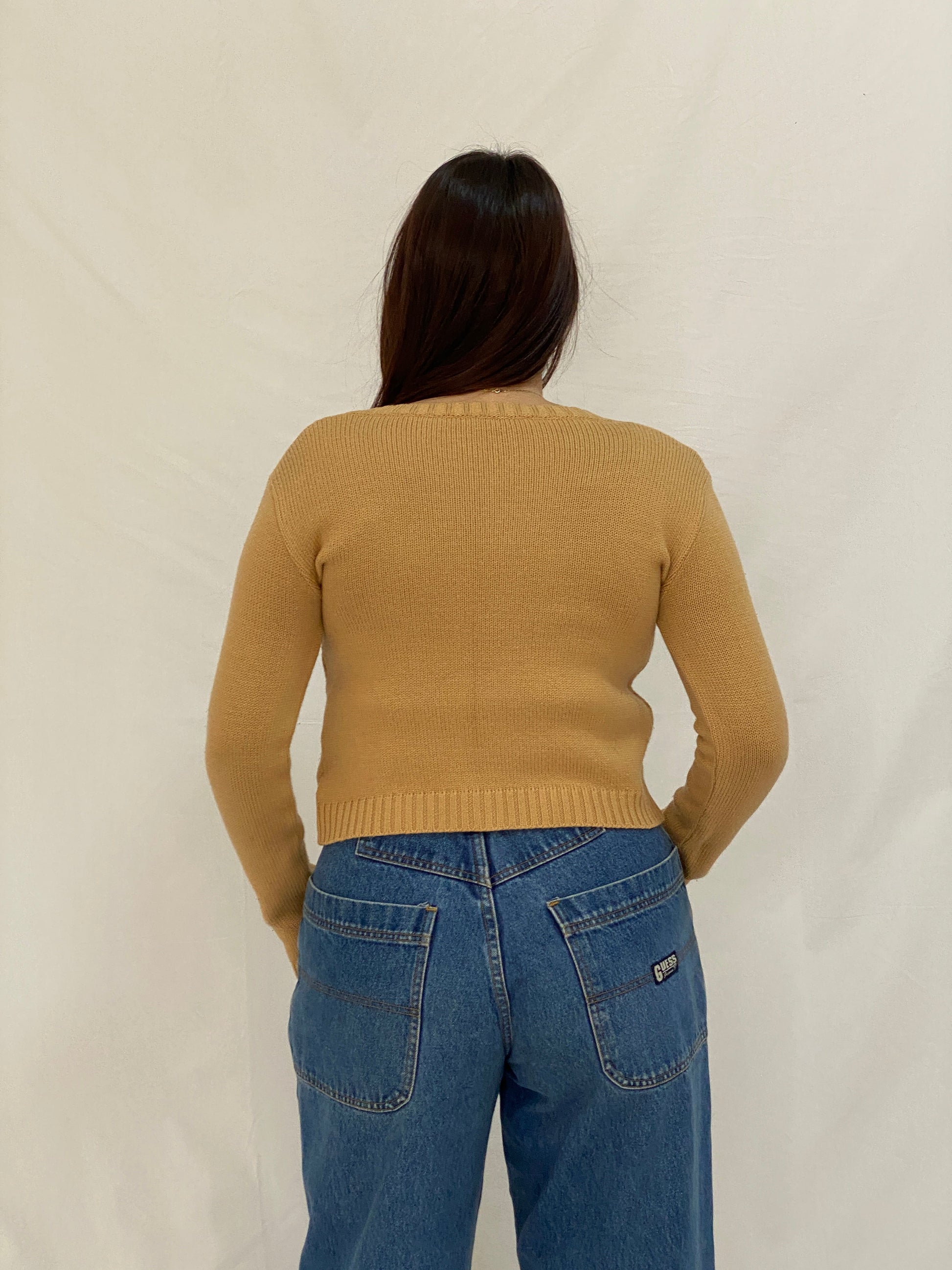 Fitted cardigan top from the Italian house, Dolce & Gabbana. This piece is crafted from a fine wool knit and features beautiful, subtle floral beading along the neckline and front placket. The slim, body-conscious fit and button-front make it a versatile piece of luxury Y2K apparel.