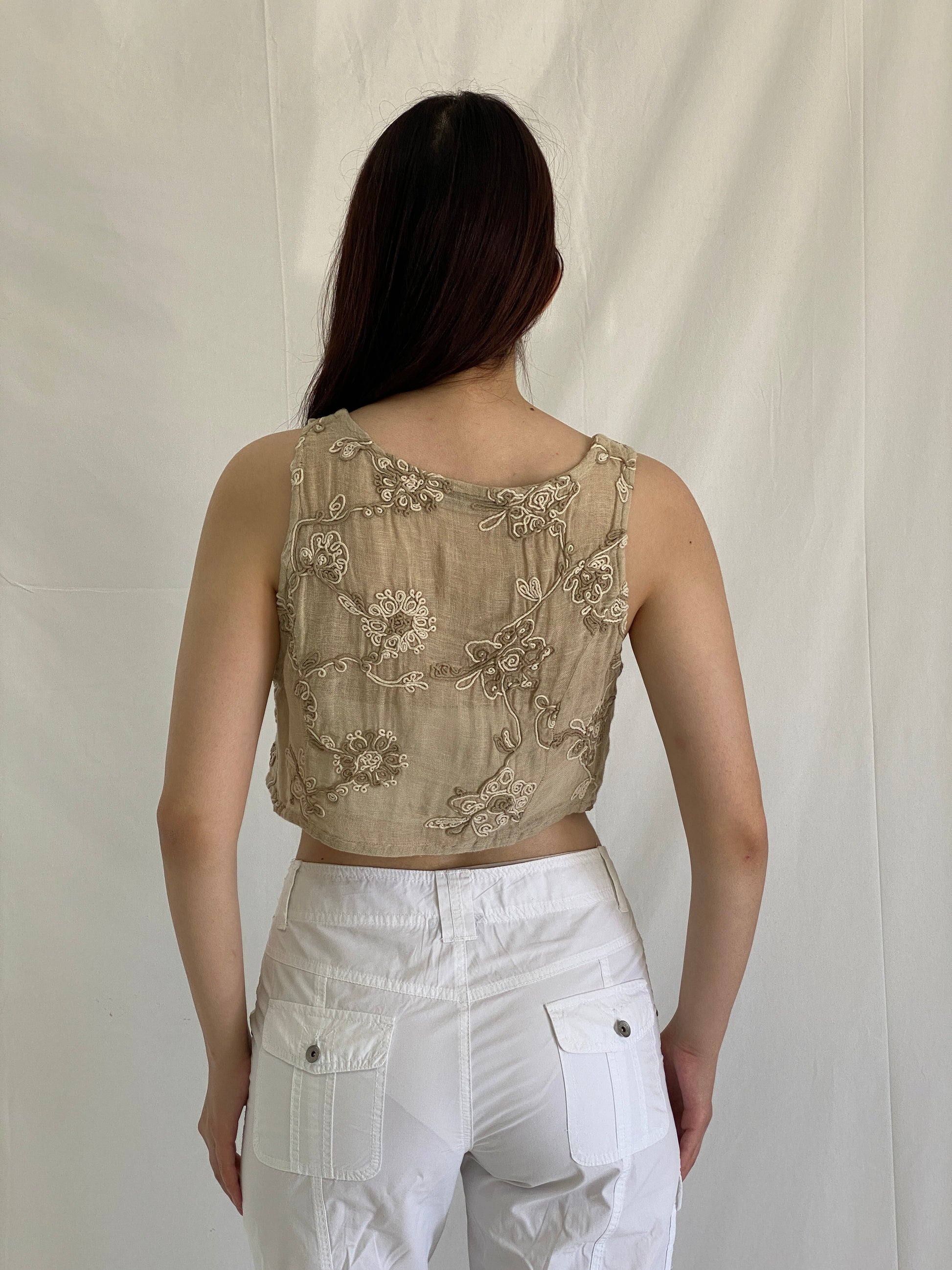 Hucke Berlin Linen Cropped Vest Embroidered Button Front Beige Sleeveless Top - M