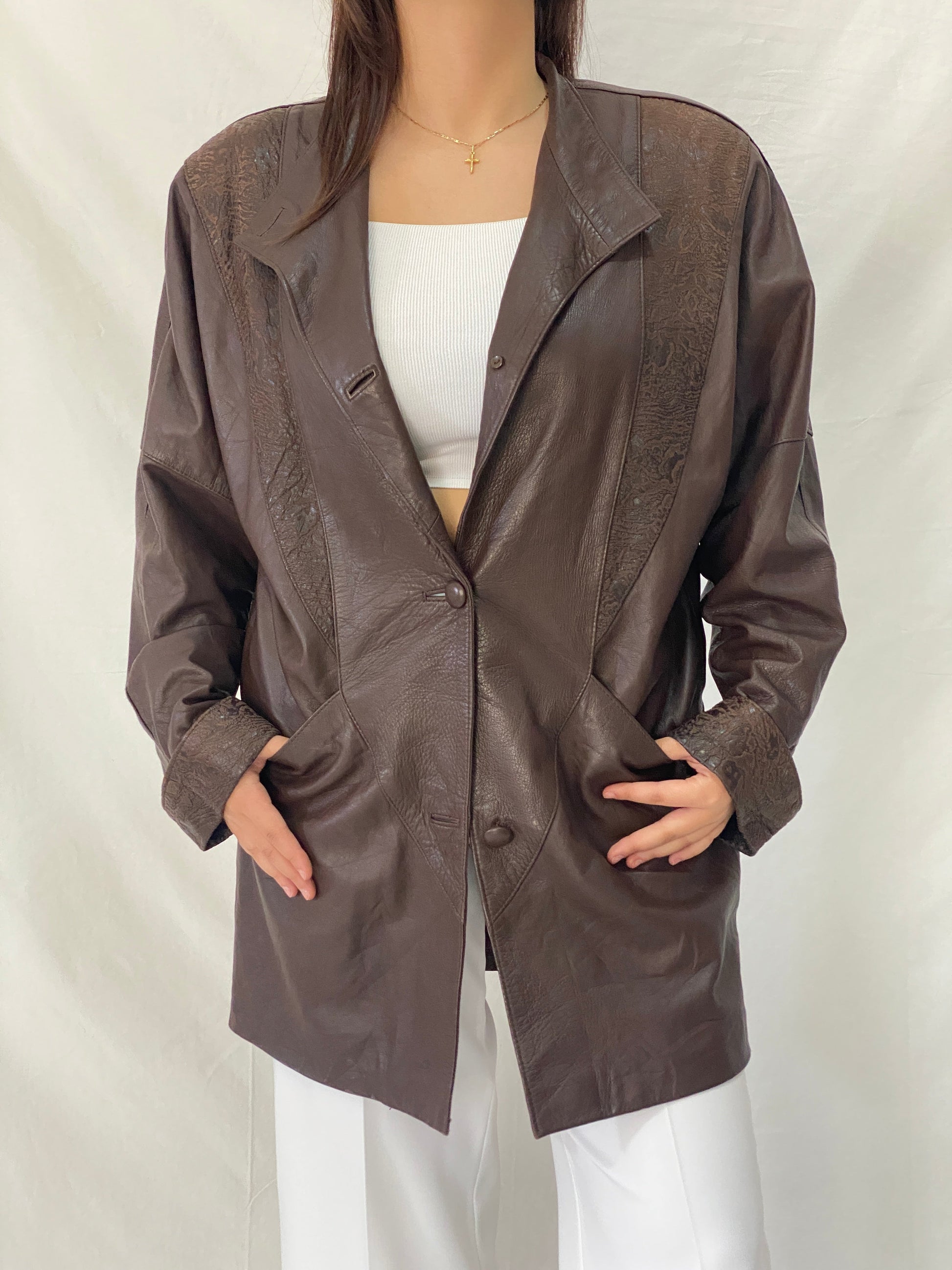 Vintage 1985 Brown Leather Blazer Coat Spanish Sheepskin Embossed Patchwork Jacket - L