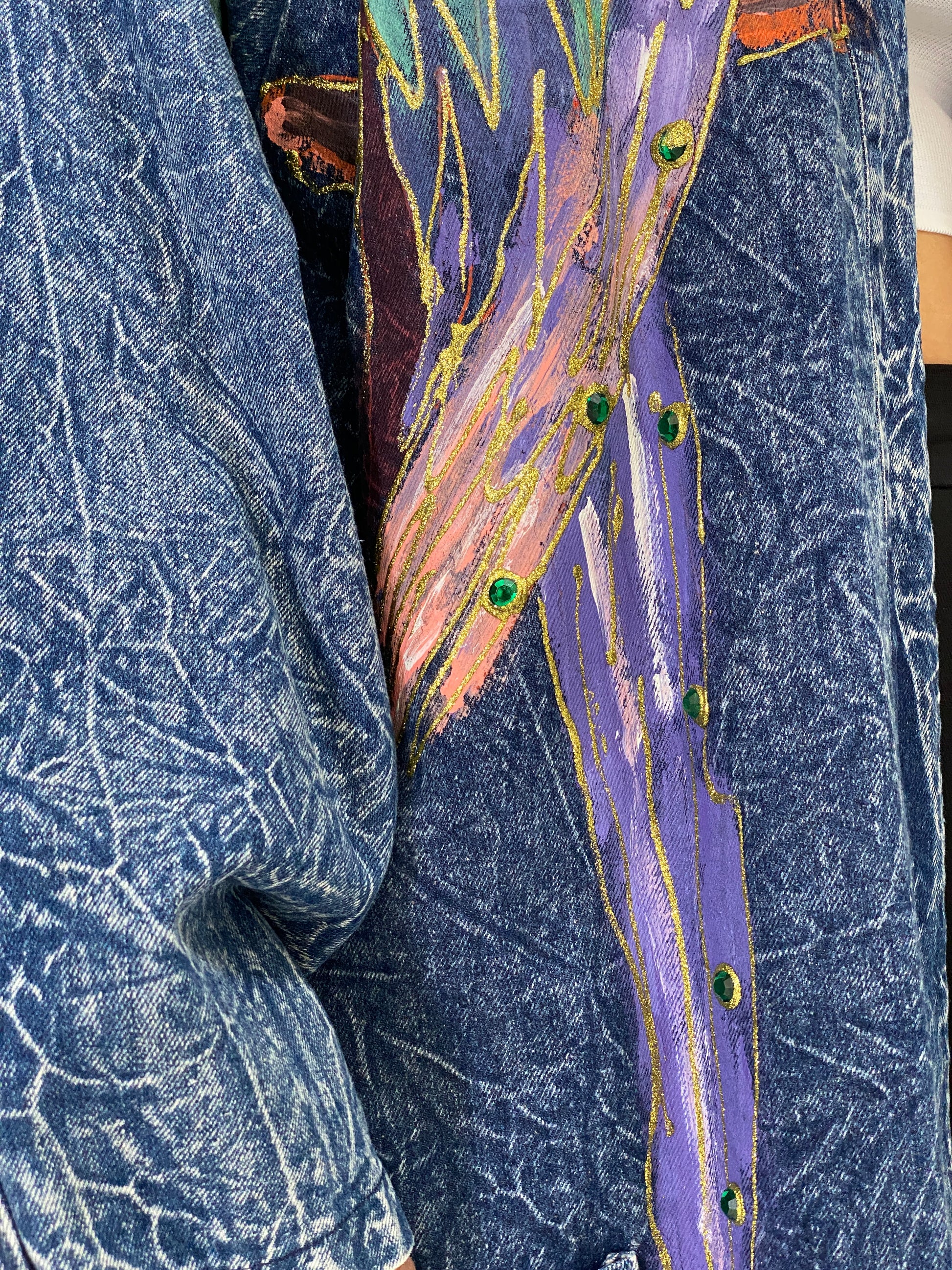 Step out in a truly unique statement piece with this authentic vintage denim coat by Christie California. Made in the USA from 100% cotton, this jacket is a vibrant throwback to the artistic and bold styles of the 1980s and early 1990s.