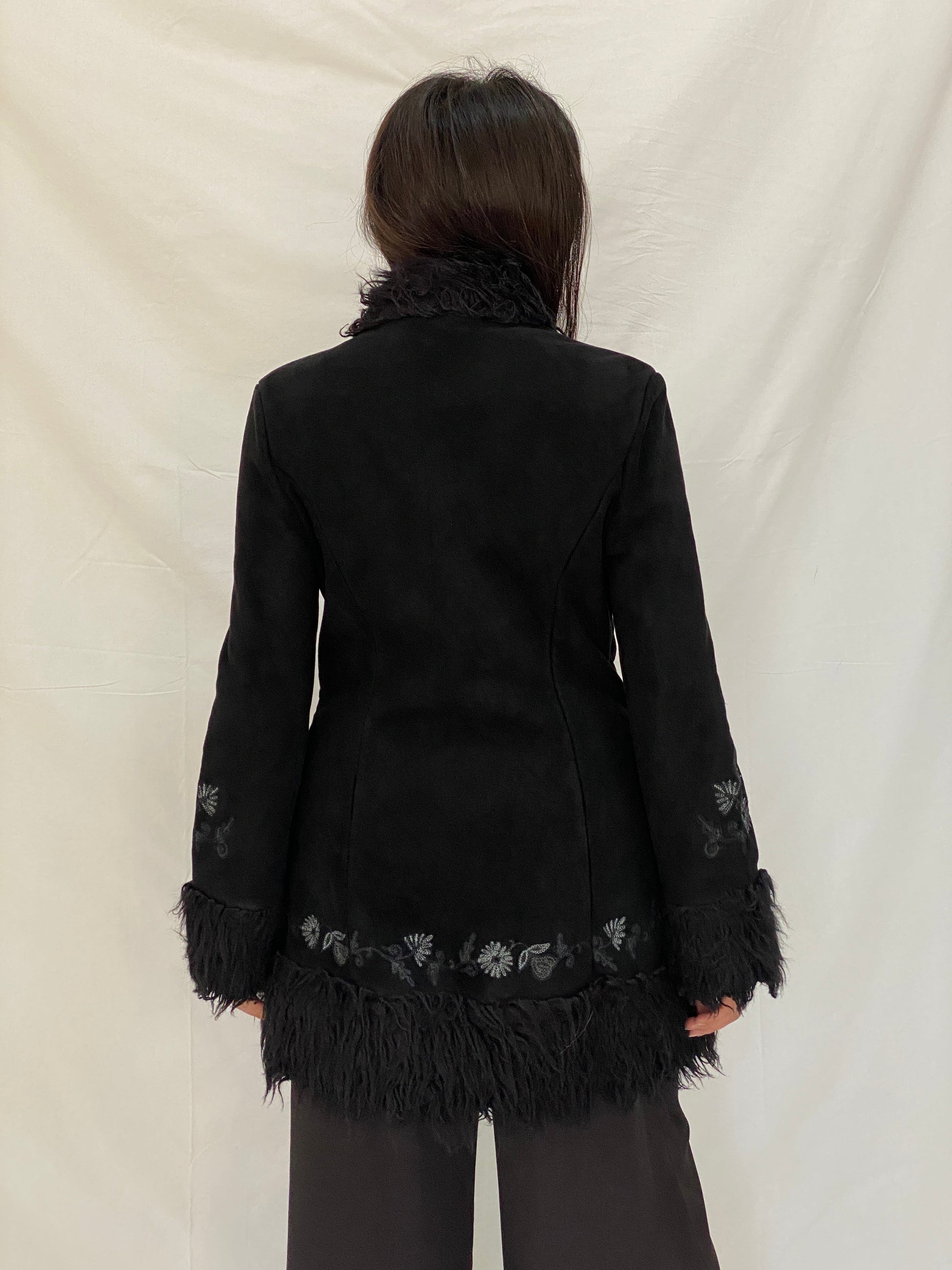 Vintage NEXT Black Embroidered Faux Suede Penny Lane Coat Y2K Boho Shaggy Trim Jacket - M