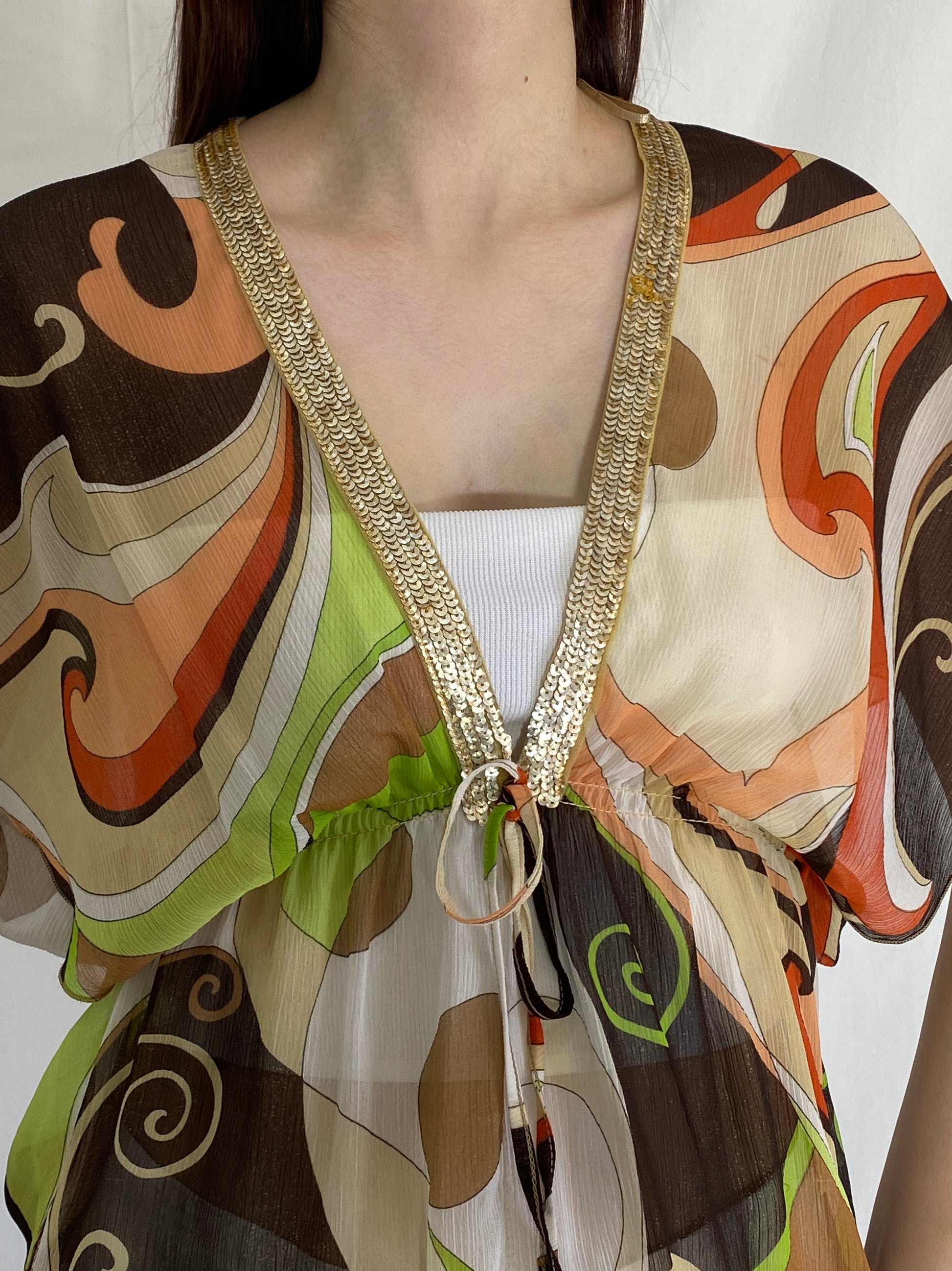 Y2K Quiz top, vintage Quiz blouse, retro swirl print top, sheer Y2K blouse, boho sequin trim top, groovy Y2K festival outfit, 2000s retro blouse, sheer printed boho blouse